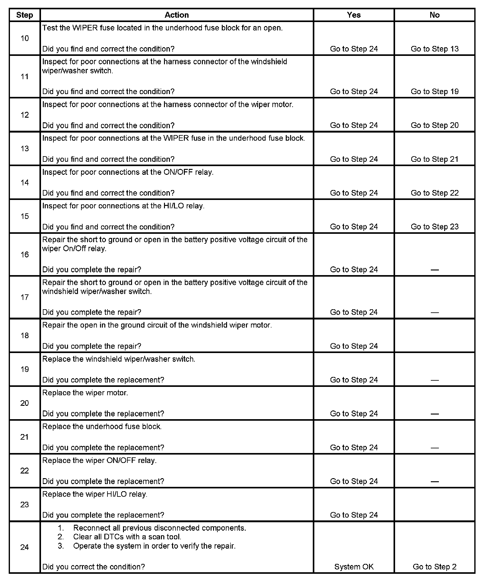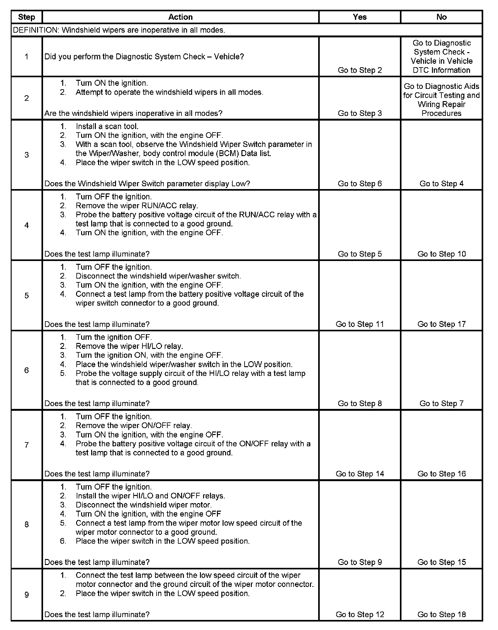 6. This step verifies that voltage is present from the ON/OFF relay with the wiper switch in the On position.