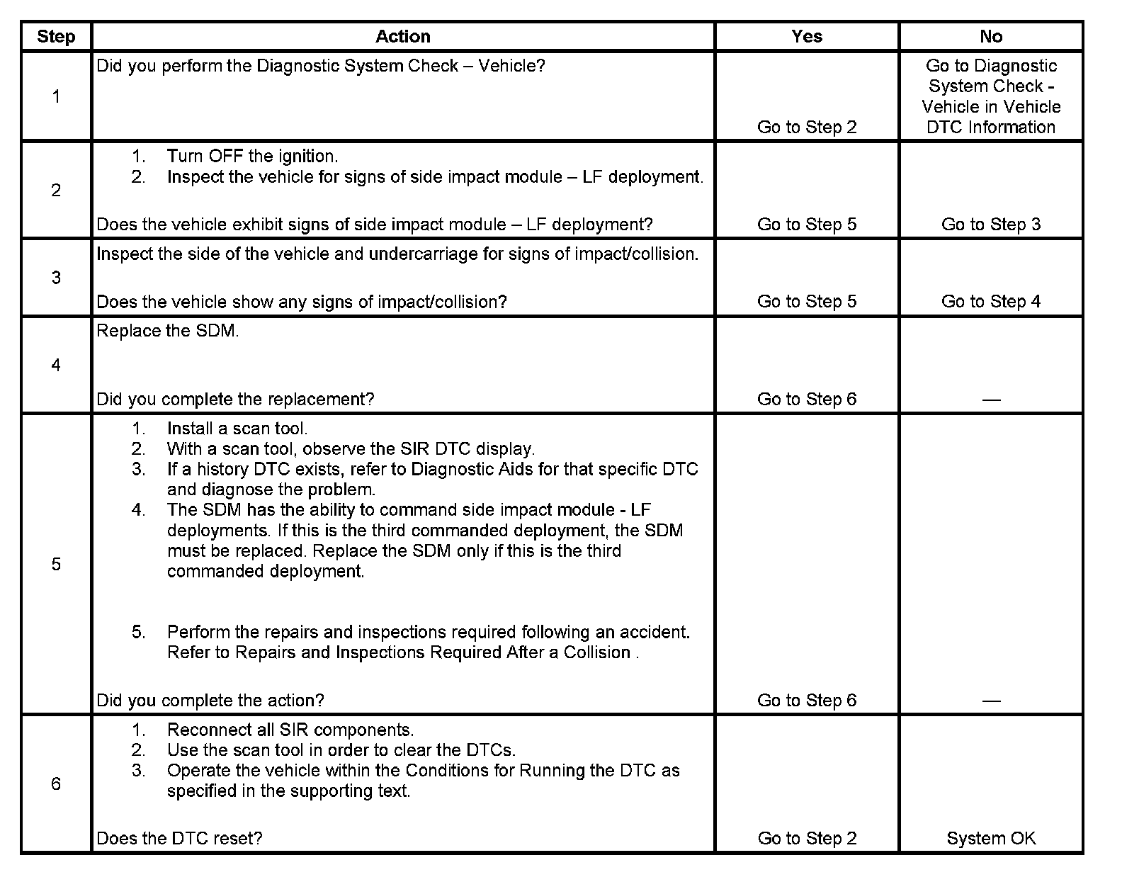 The inflatable restraint sensing and diagnostic module (SDM) contains a sensing device which converts vehicle velocity changes to an electrical signal. The SDM processes the generated electrical signals and compares them to values stored in memory. When the generated signals exceed the stored value, the SDM performs additional signal processing and compares the generated signals to signals stored in memory. When two of the generated signals exceed the stored values, the SDM causes current to flow through the inflatable restraint side impact module - LF, deploying the side impact module - LF and causing Diagnostic Trouble Code (DTC) B0034 to set.