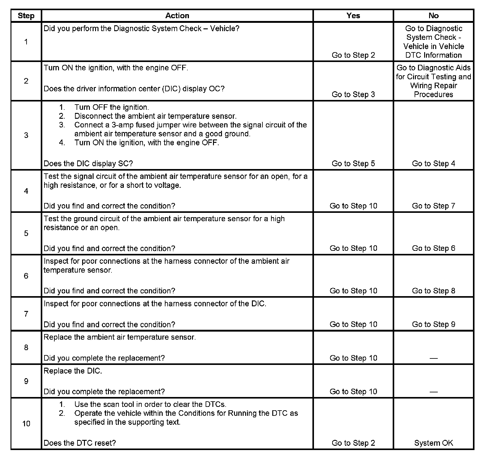 The driver information center (DIC) monitors the signal circuit of the ambient air temperature sensor. The ambient air temperature sensor is a thermistor which varies in resistance as the temperature changes. As the resistance of the ambient air temperature sensor increases, the DIC senses a larger voltage drop across the sensor, indicating a lower temperature. As the resistance of the ambient air temperature sensor decreases, the DIC senses a small voltage drop across the sensor, indicating a higher temperature.