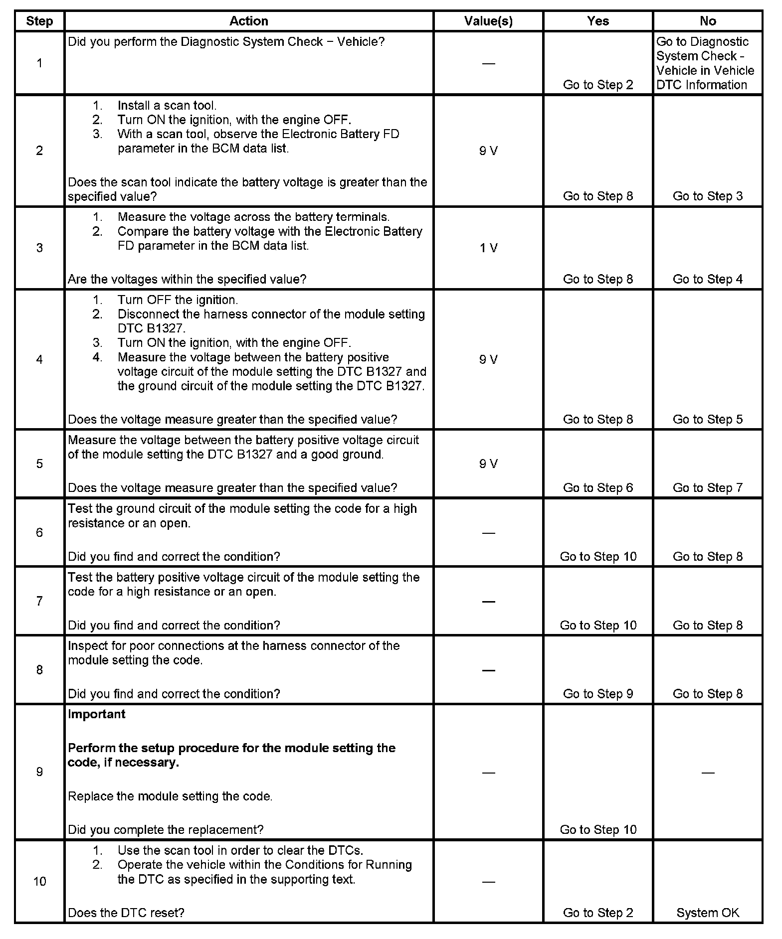- This DTC shall be set as current when the voltage falls below 9.0 volts for 1200 milliseconds.