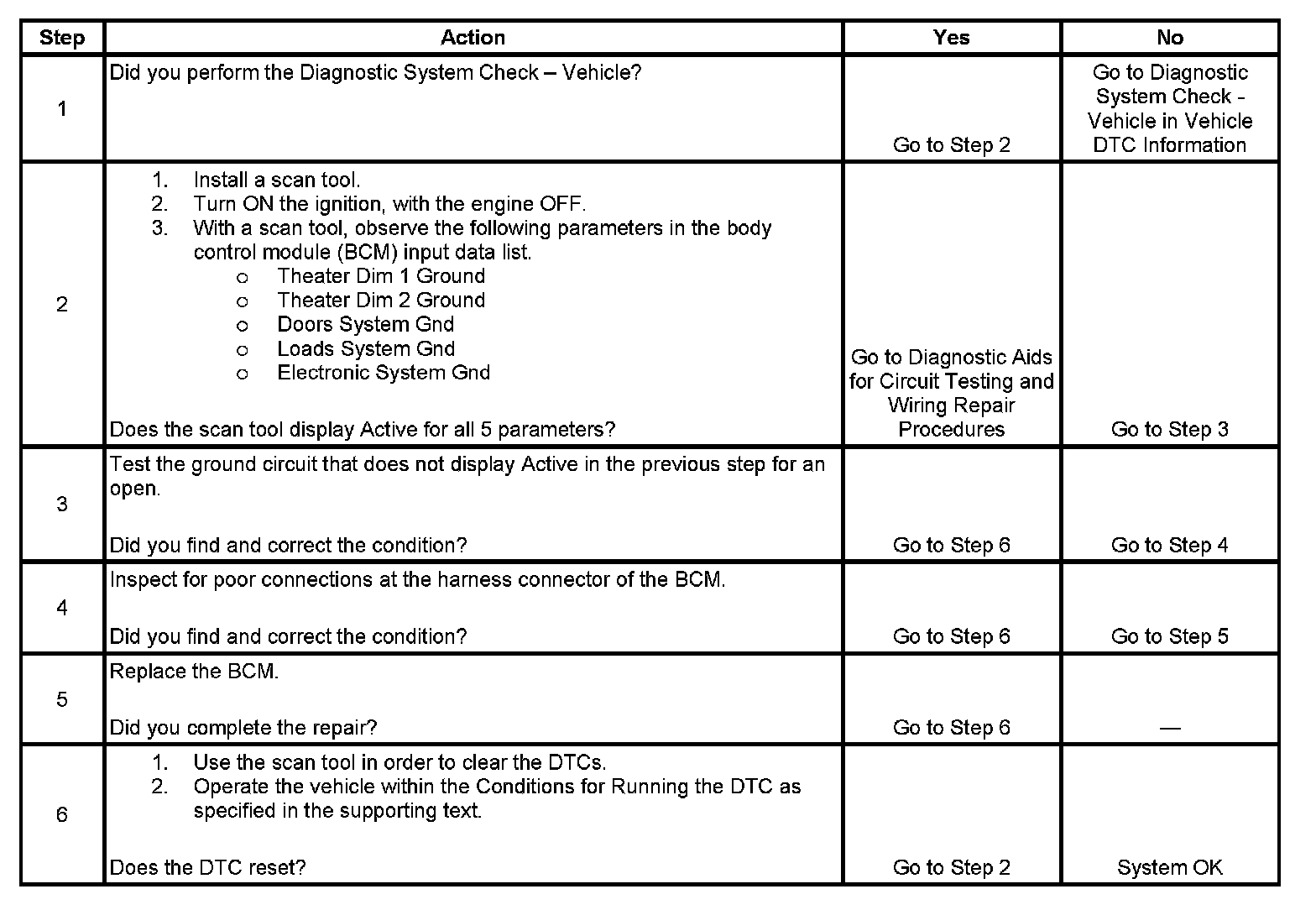 The body control module (BCM) ground circuits provide ground for the 2 Theater Dimming systems for interior lamps, brake transmission shift interlock (BTSI) solenoid, BCM electronics and the door locks.