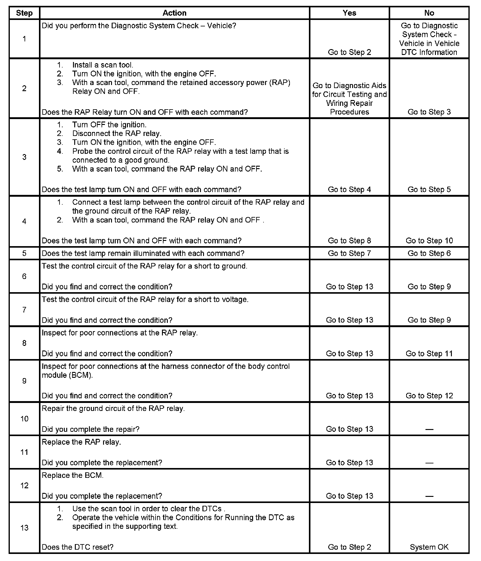 - The BCM detects no voltage at the RAP relay control circuit when the BCM is trying to energize the RAP relay.