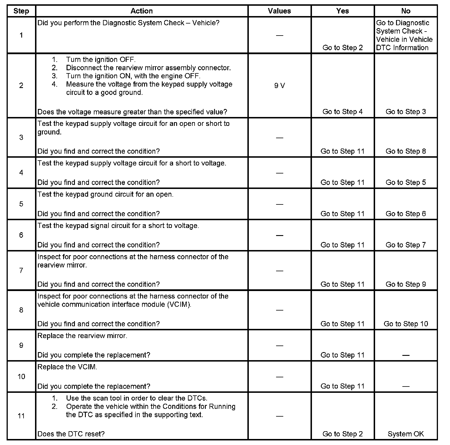 The OnStar(R) button assembly consists of 3 buttons, Call/Answer, OnStar(R) Call Center, and OnStar(R) Emergency. Ten volts are supplied to the button assembly on the keypad supply voltage circuit. Each of the buttons, when pressed, complete the circuit across a resister allowing a specific voltage to be returned to the vehicle communication interface module (VCIM) on the keypad signal circuit. Depending upon the voltage range returned, the VISUM is able to identify which button has been pressed.