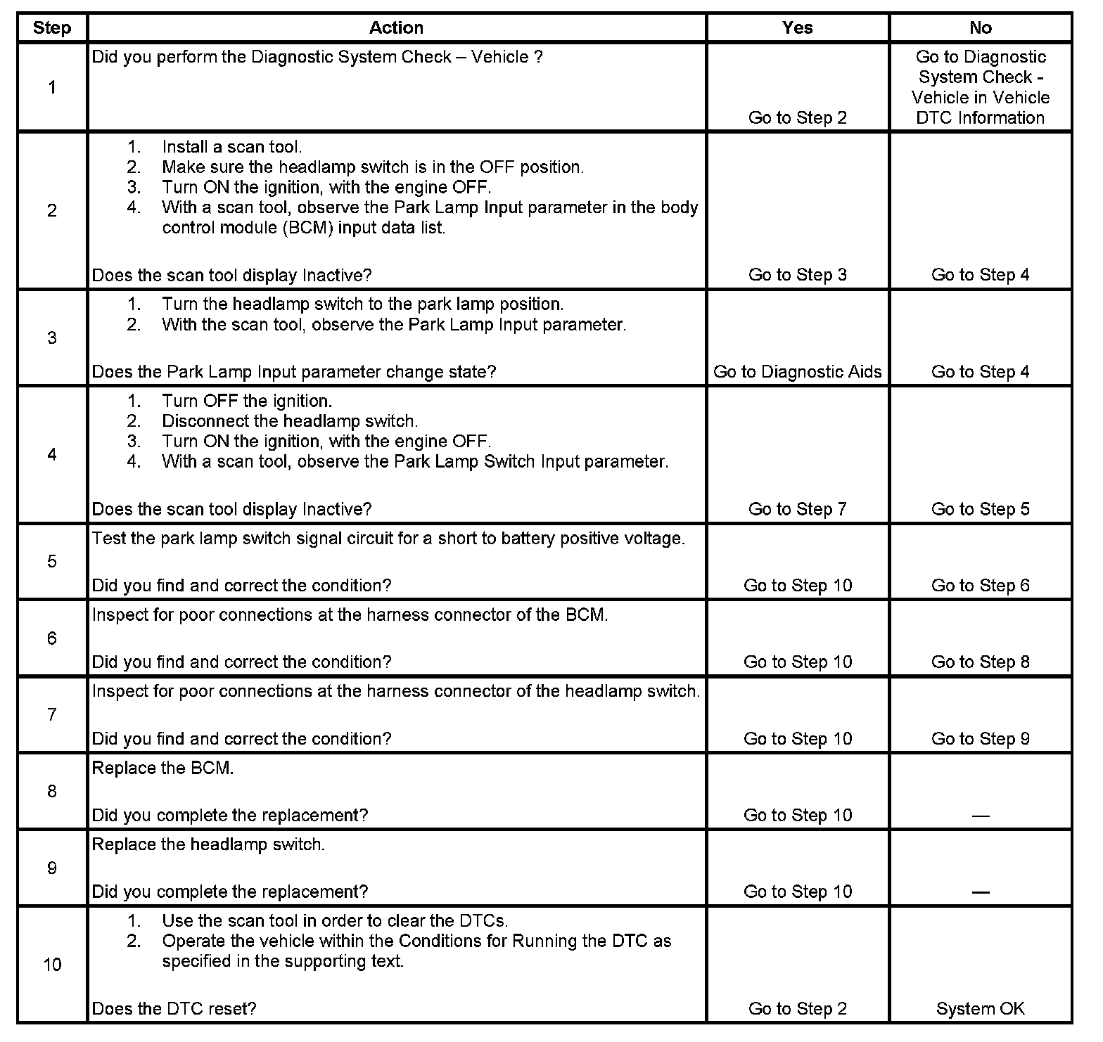 The BCM detects a short to battery or open in the park lamp circuit when the headlamp switch is in the PARK position.
