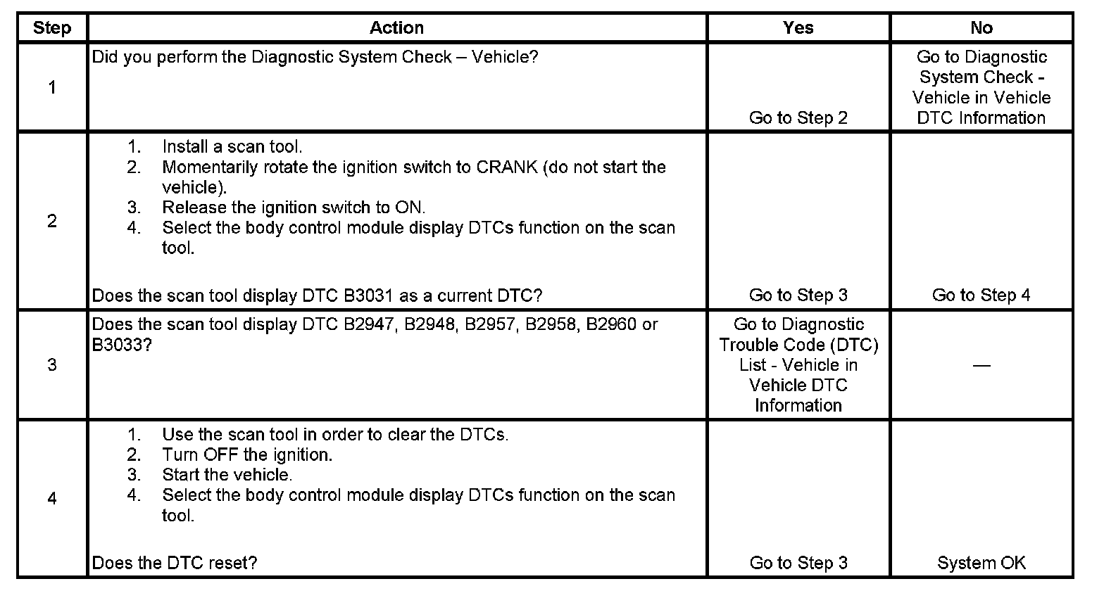 - If DTC B3031 is set in the BCM as a history DTC, clear the DTC and recheck the system. A history DTC B3031 indicates that the BCM has successfully completed the programming mode.