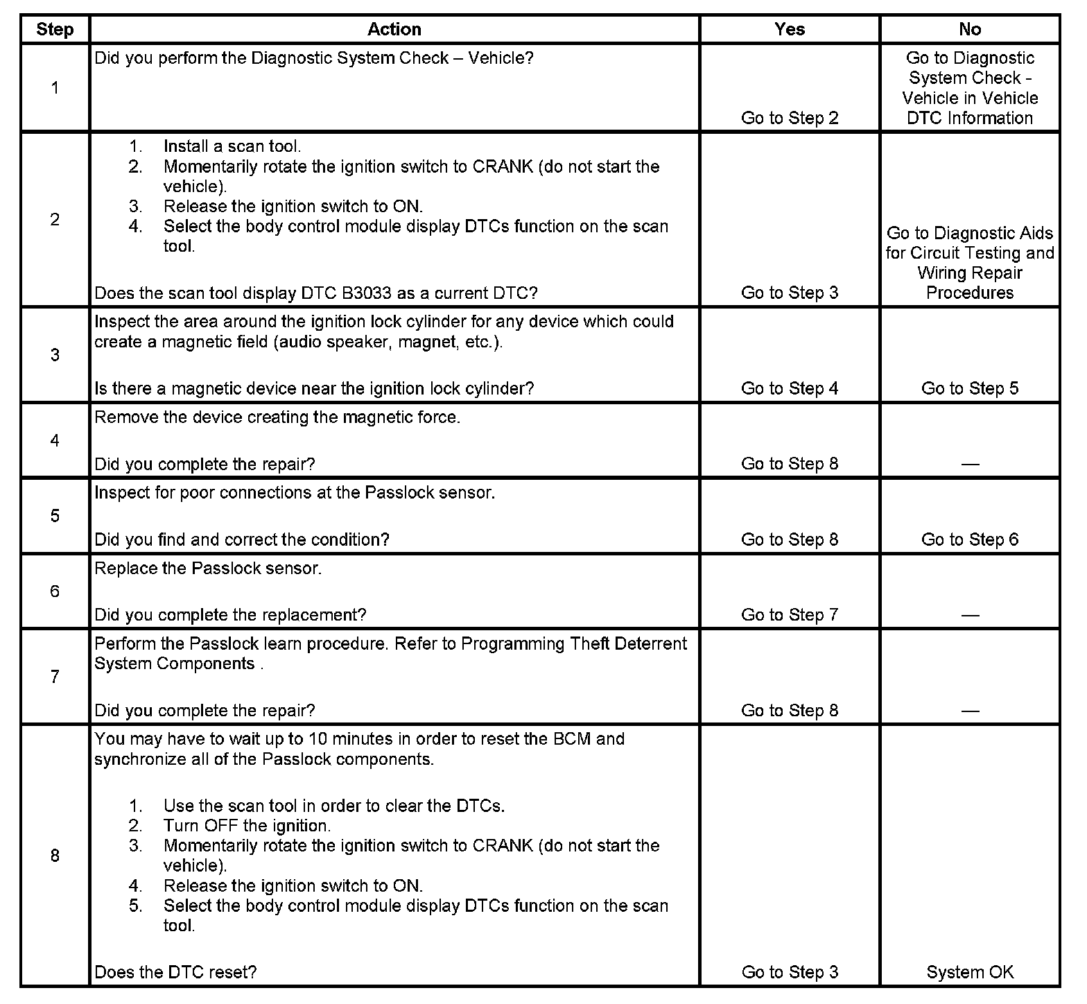 - A current DTC B3033 clears when the BCM detects a valid Passlock sensor code.