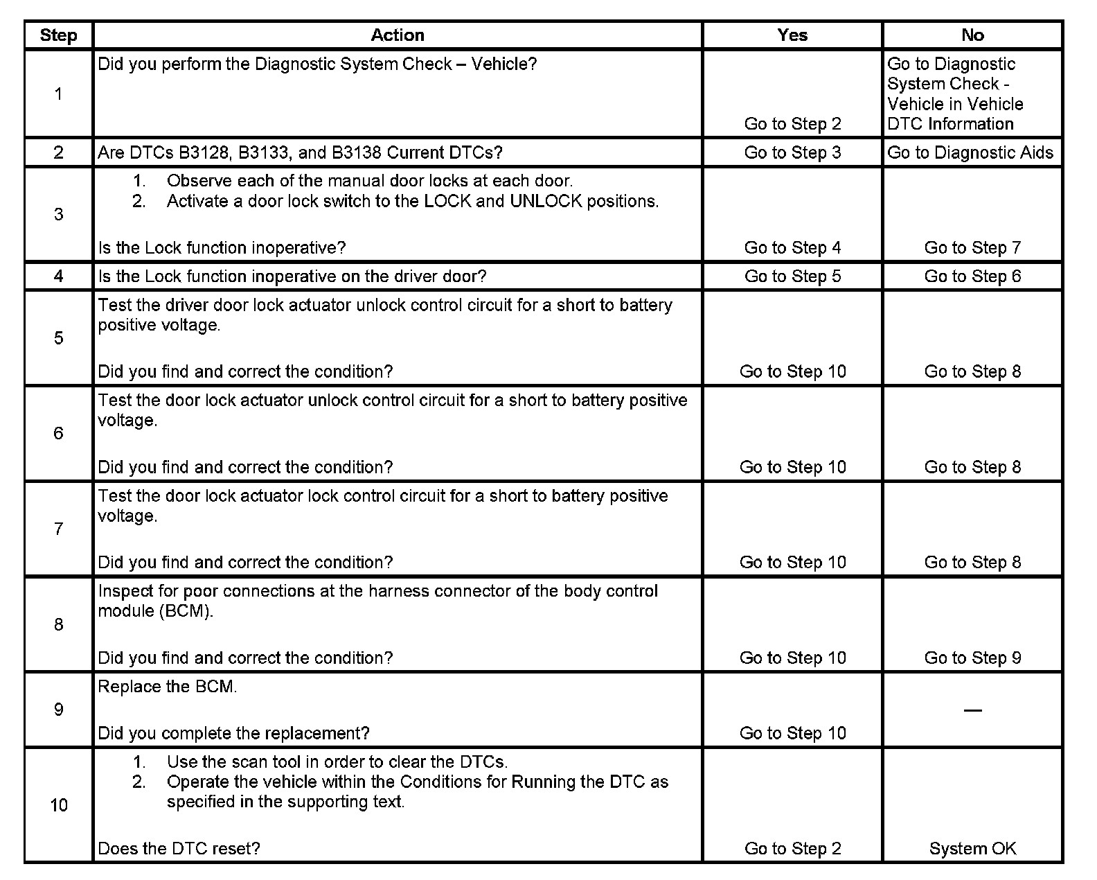 - A current DTC B3128, B3133, or B3138 is cleared when the BCM no longer detects a short to voltage on the door lock actuator lock control circuit, door lock actuator unlock control circuit, or driver door lock actuator unlock control circuit for greater than 150 milliseconds.
