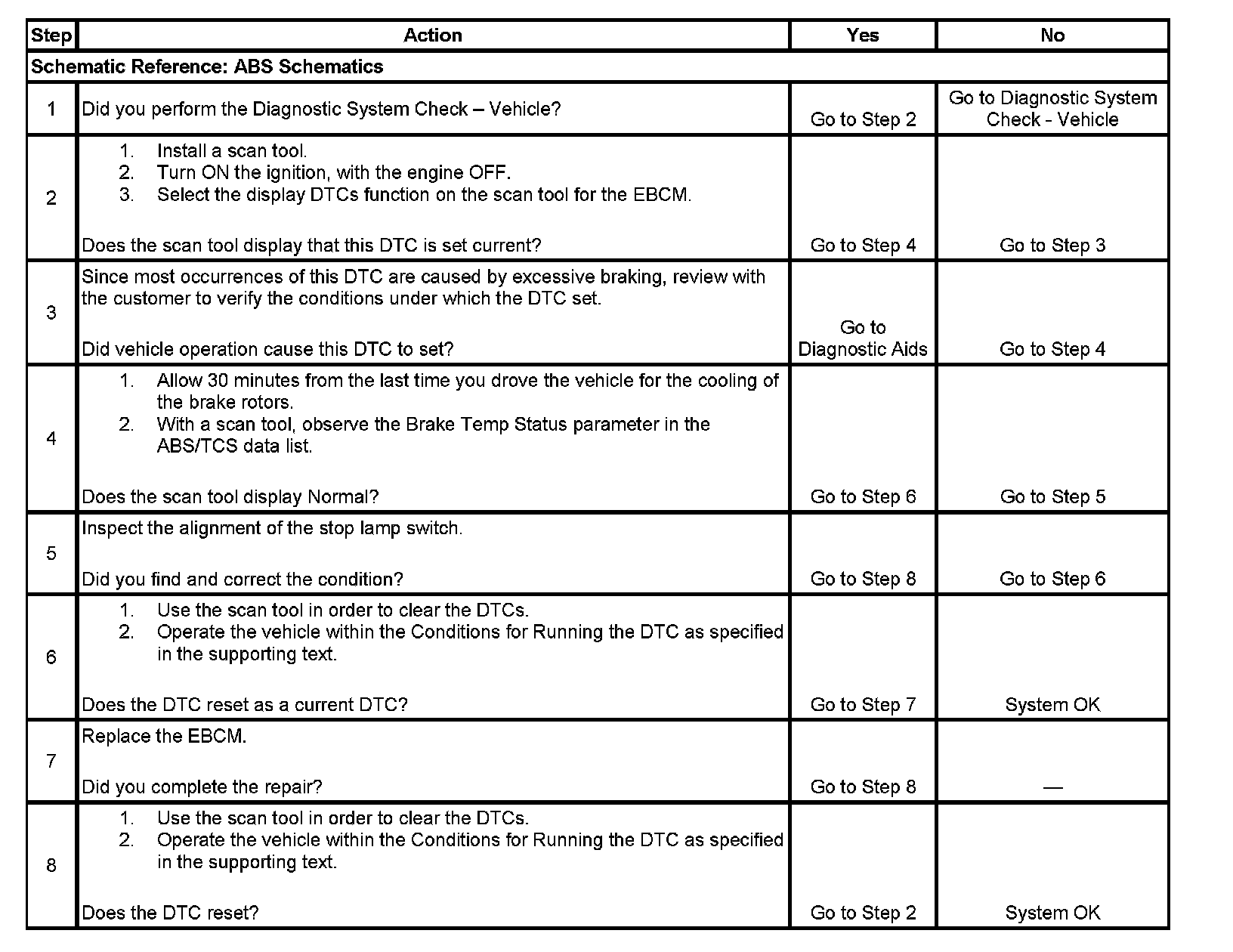 This DTC sets when the estimated brake rotor temperature of either of the drive wheels exceeds 375°C (700°F). When the estimated brake rotor temperature of either of the drive wheels exceeds 375°C (700°F) during normal braking or normal ABS operations, the DTC does not set until the next TCS activation. The brake rotor temperature can exceed 375°C (700°F) without setting the DTC if a TCS activation has not occurred. When the estimated brake rotor temperature of either of the drive wheels exceeds 375°C (700°F) during a TCS activation, the DTC sets immediately, but the EBCM does not disable TCS until the end of the TCS event.