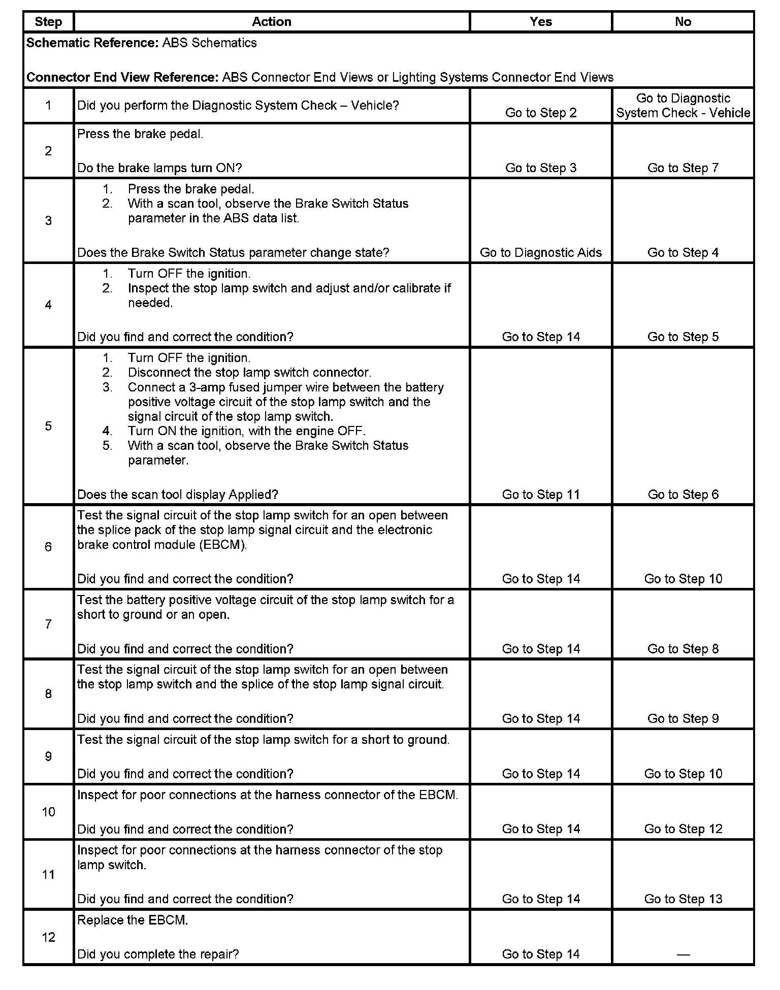 The electronic brake control module (EBCM) sources 5 volts on the stop lamp switch signal circuit when the stop lamp switch is inactive. The voltage is supplied a ground path through the stop lamp bulbs.