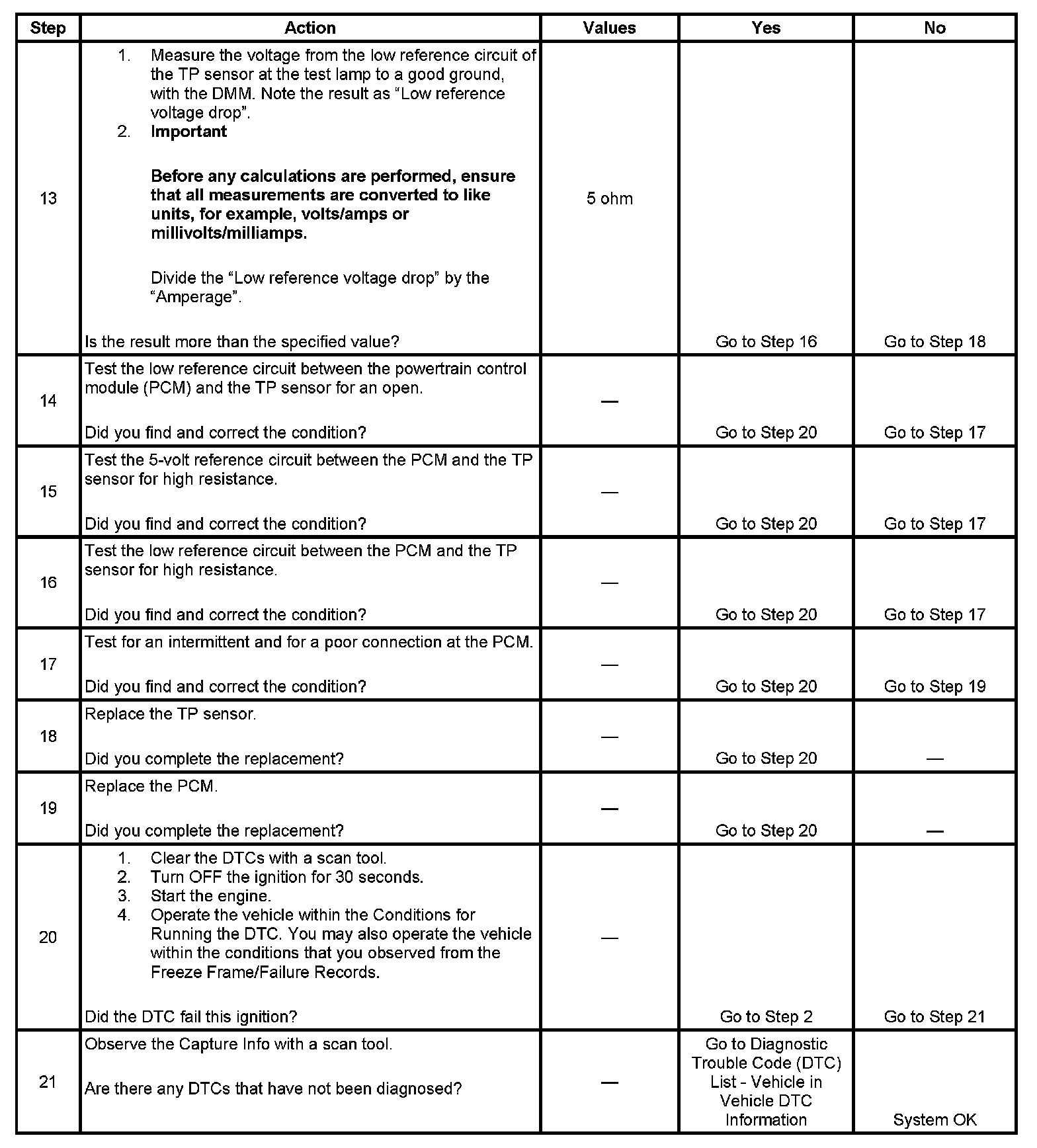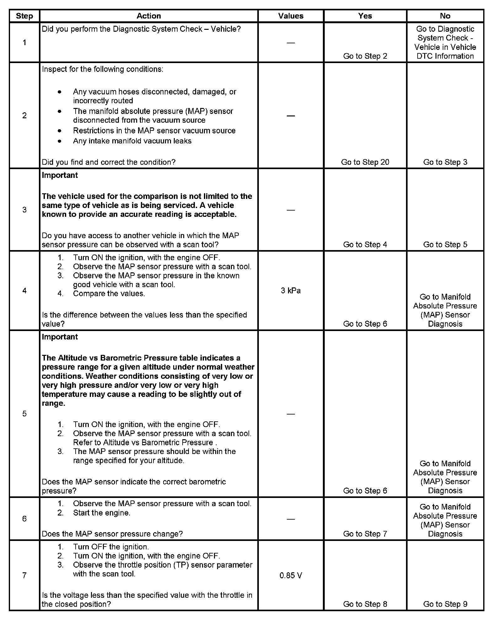 The numbers below refer to the step numbers on the diagnostic table.