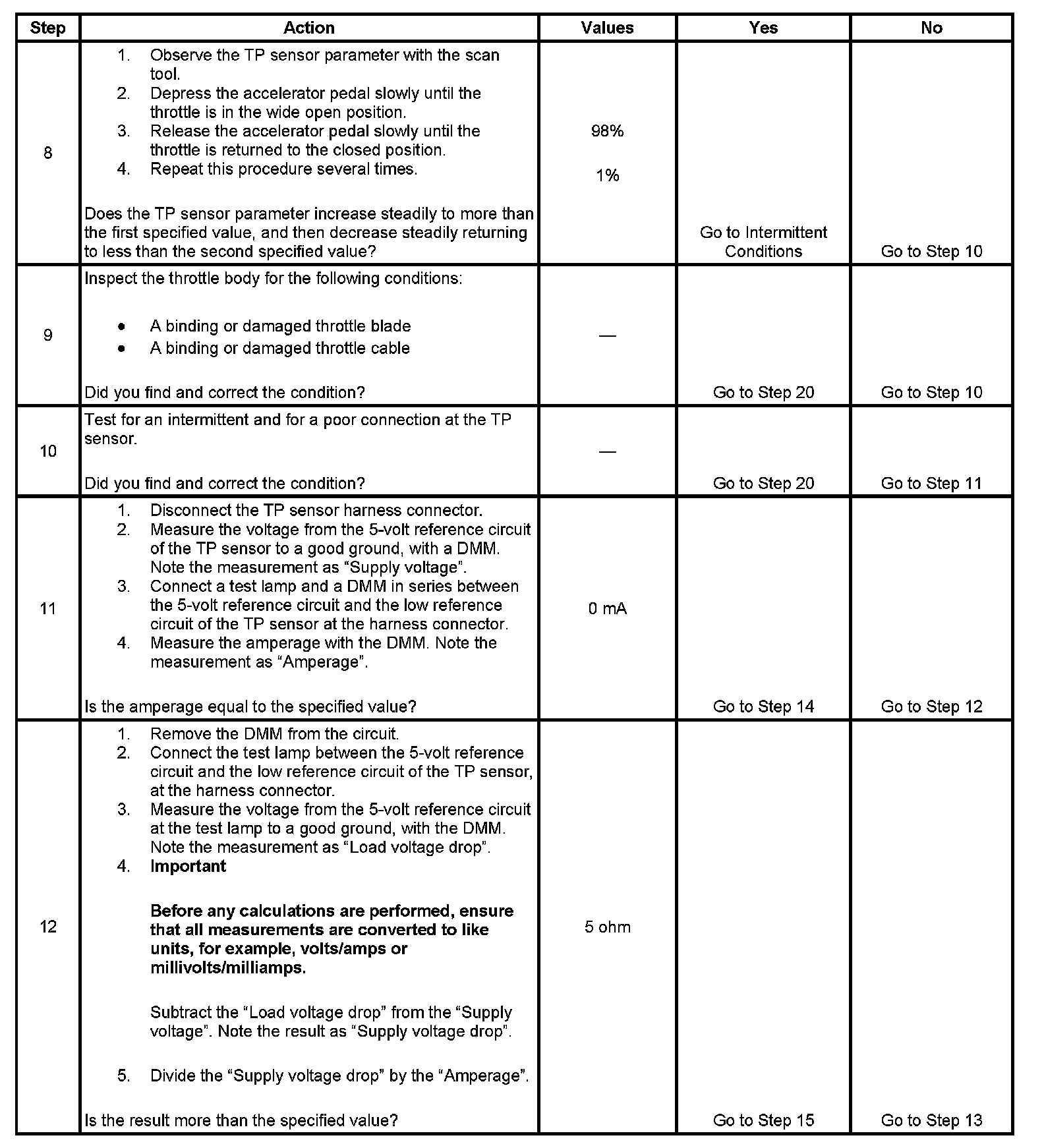 The throttle position (TP) sensor is used by the powertrain control module (PCM) to determine the throttle plate angle for various engine management systems. The TP sensor is a potentiometer type sensor with 3 circuits: