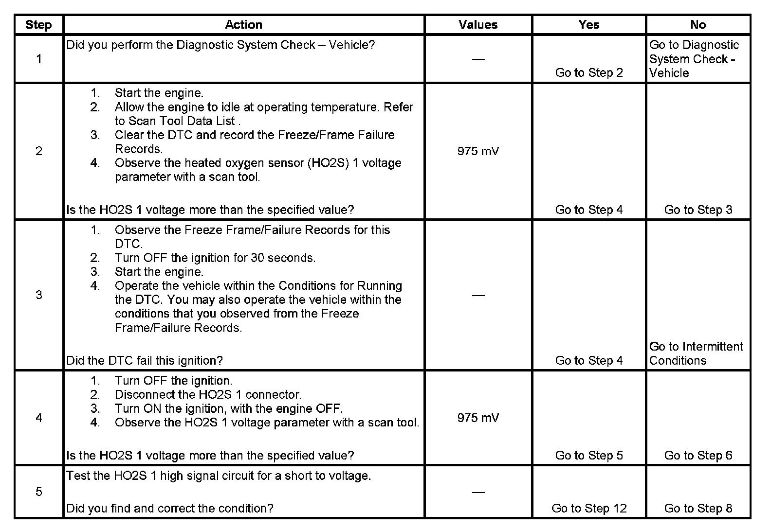 If the PCM detects that the HO2S 1 voltage is above a calibrated amount for an excessive amount of time, DTC P0132 will set.