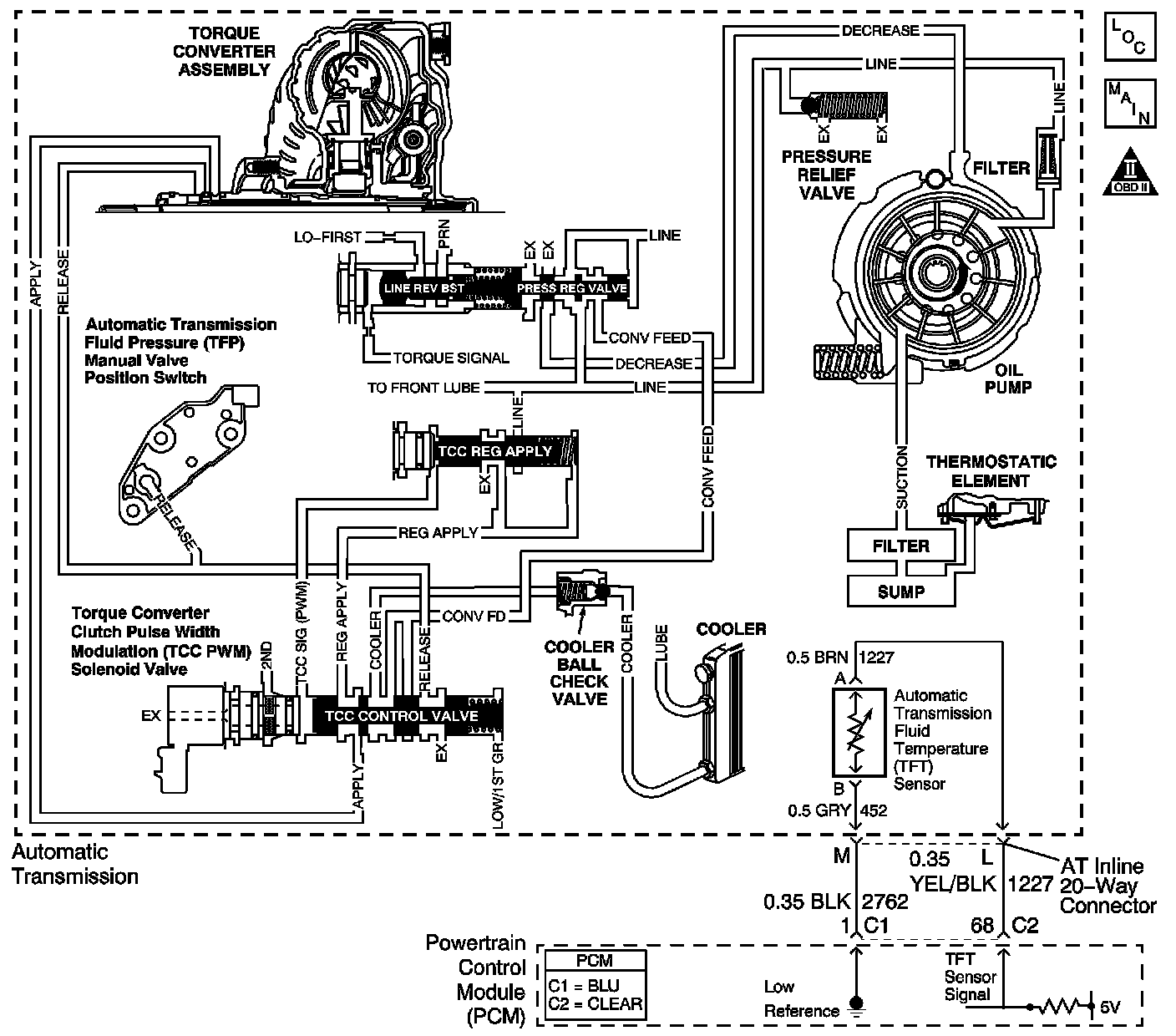 Hot fluid from the torque converter flows through the TCC control valve into the cooler lines to the oil cooler located in the vehicle radiator and auxiliary cooler, if equipped. Cool fluid then returns to lubricate the final drive assembly and other components along the output shaft.