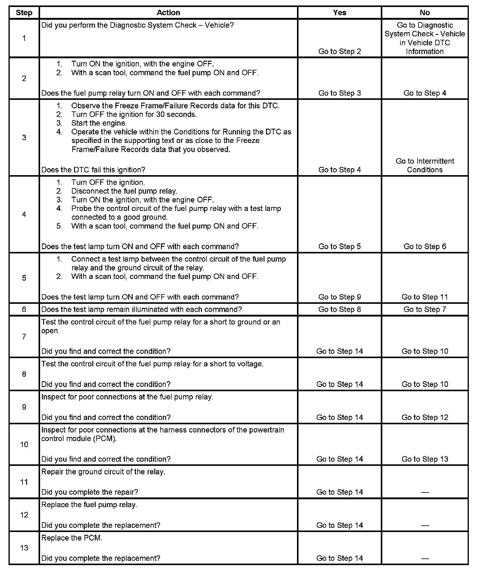 - The PCM detects an incorrect voltage on the control circuit of the fuel pump relay.