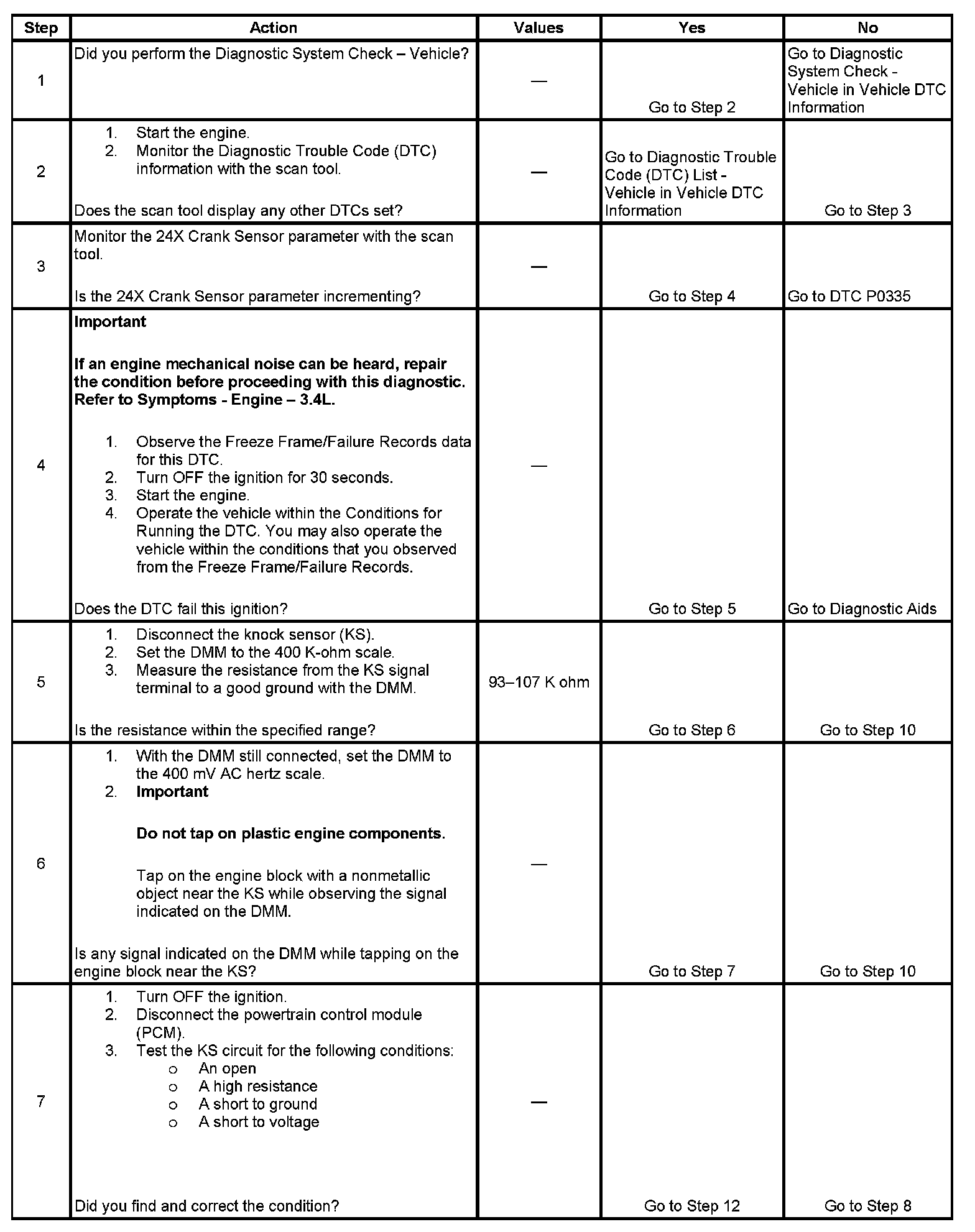 The numbers below refer to the step numbers on the diagnostic table.