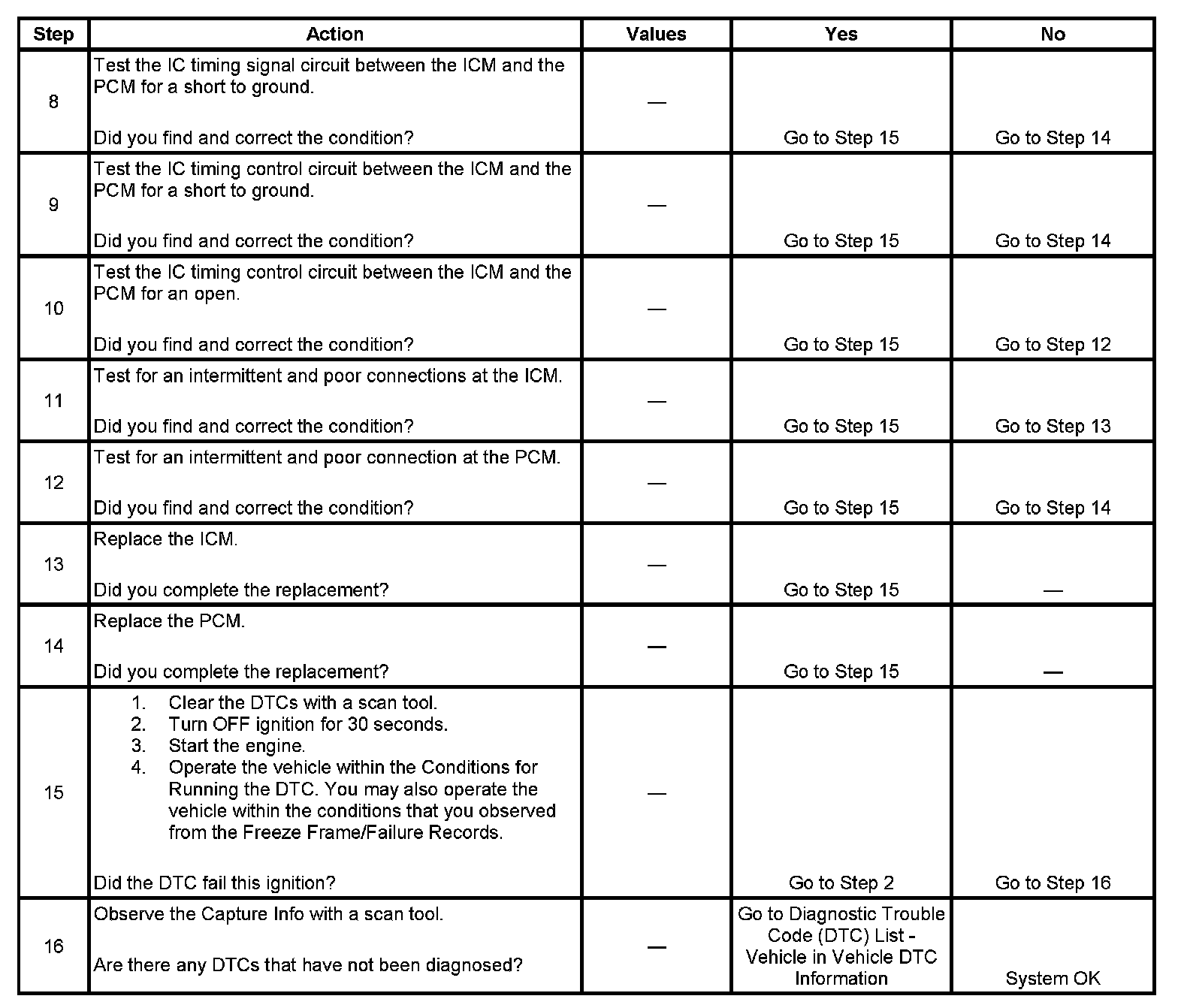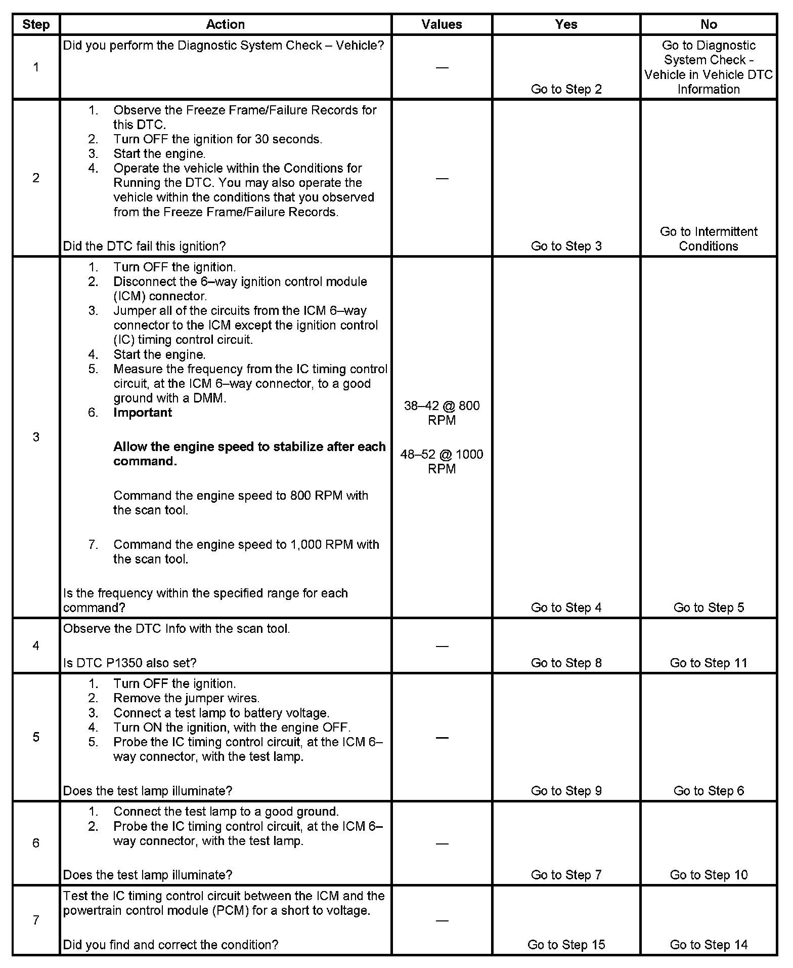 The PCM sends spark timing signals to the ICM on the IC timing control circuit, but during cranking, the ICM grounds these signals. When the PCM begins receiving the 3X reference pulses from the ICM and the engine starts, the PCM applies 5 volts to the IC timing signal circuit allowing the ICM to switch to the IC mode of operation and respond to the spark timing signals from the PCM. The PCM monitors the IC timing control circuit for errors. If the PCM detects a fault, DTC P0350 sets.