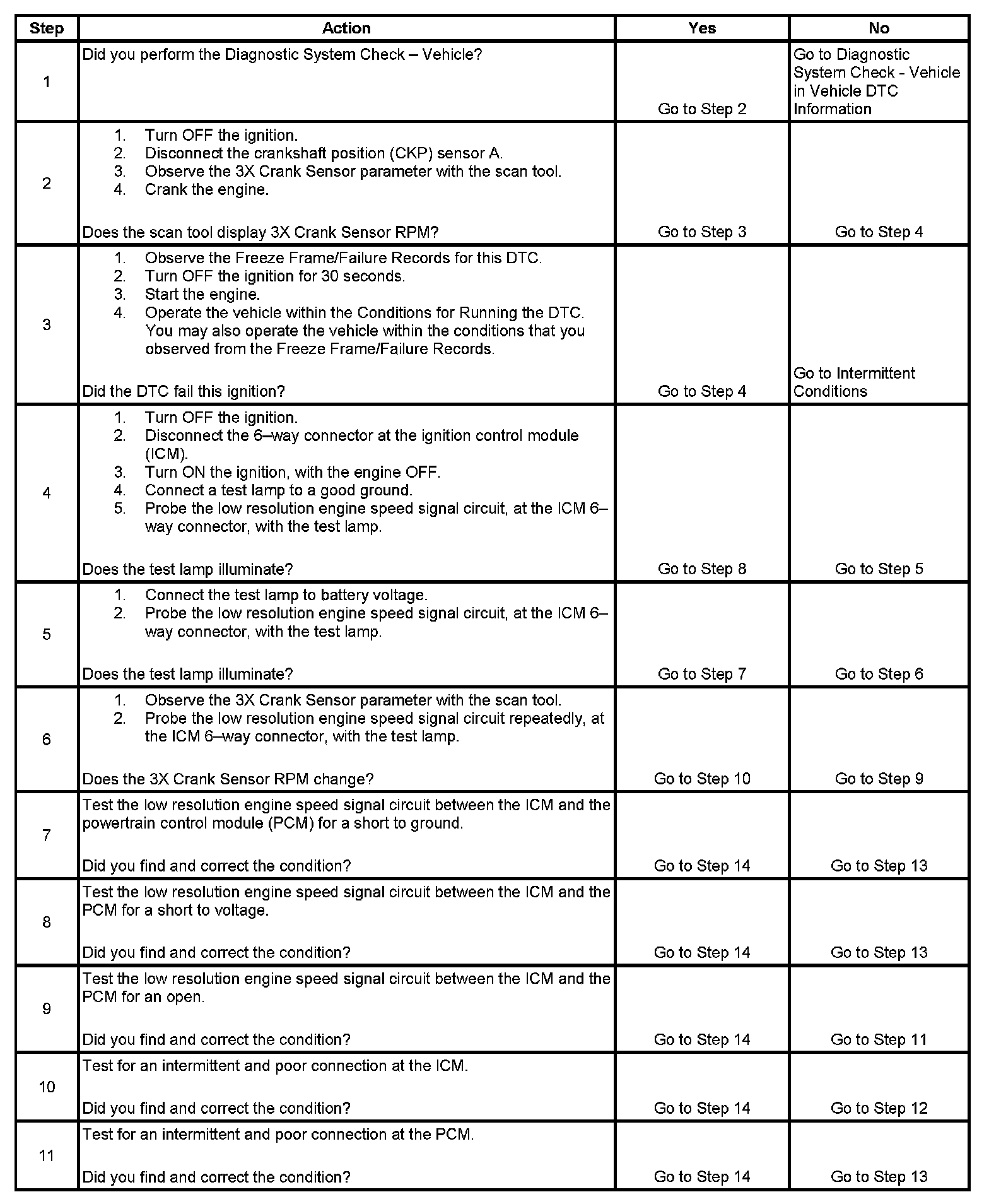 The crankshaft position (CKP) sensor B is a 7X variable reluctance sensor. This produces 7 digital ON/OFF pulses per engine revolution. These pulses occur when a reluctor wheel, mounted to the crankshaft and containing 6 slots evenly spaced 60 degrees apart and 1 slot spaced at 10 degrees, passes by the sensor. The 7X sensor is connected directly to the ignition control module (ICM). The sensor wiring includes 2 circuits, a CKP sensor signal circuit and a low reference circuit. The ICM uses the 7X signal to determine the engine position and speed. A signal converter within the ICM produces a digital 3X output pulse to the powertrain control module (PCM) on the low resolution engine speed signal circuit. The PCM monitors the low resolution engine speed signal circuit for errors. If the PCM receives no signal from the ICM, DTC P0385 sets.