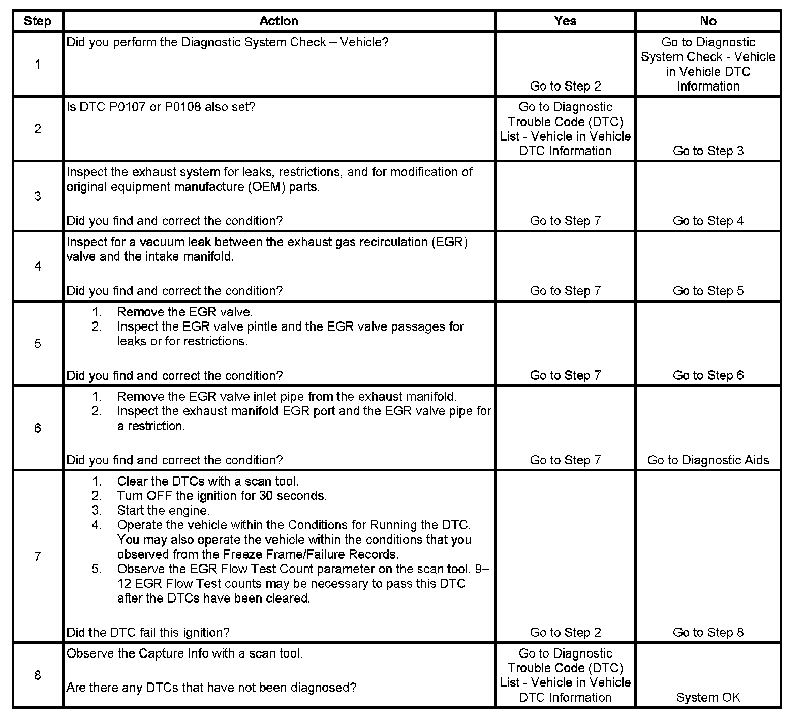Normally, the PCM will only allow one EGR flow test during an ignition cycle. To aid in verifying a repair, the PCM will allow up to 12 EGR flow test counts during the first ignition cycle following a code clear event. Between 9-12 EGR flow test counts should be sufficient for the PCM to determine adequate EGR flow and pass the EGR flow test. If the PCM detects an EGR flow error, DTC P0401 sets.