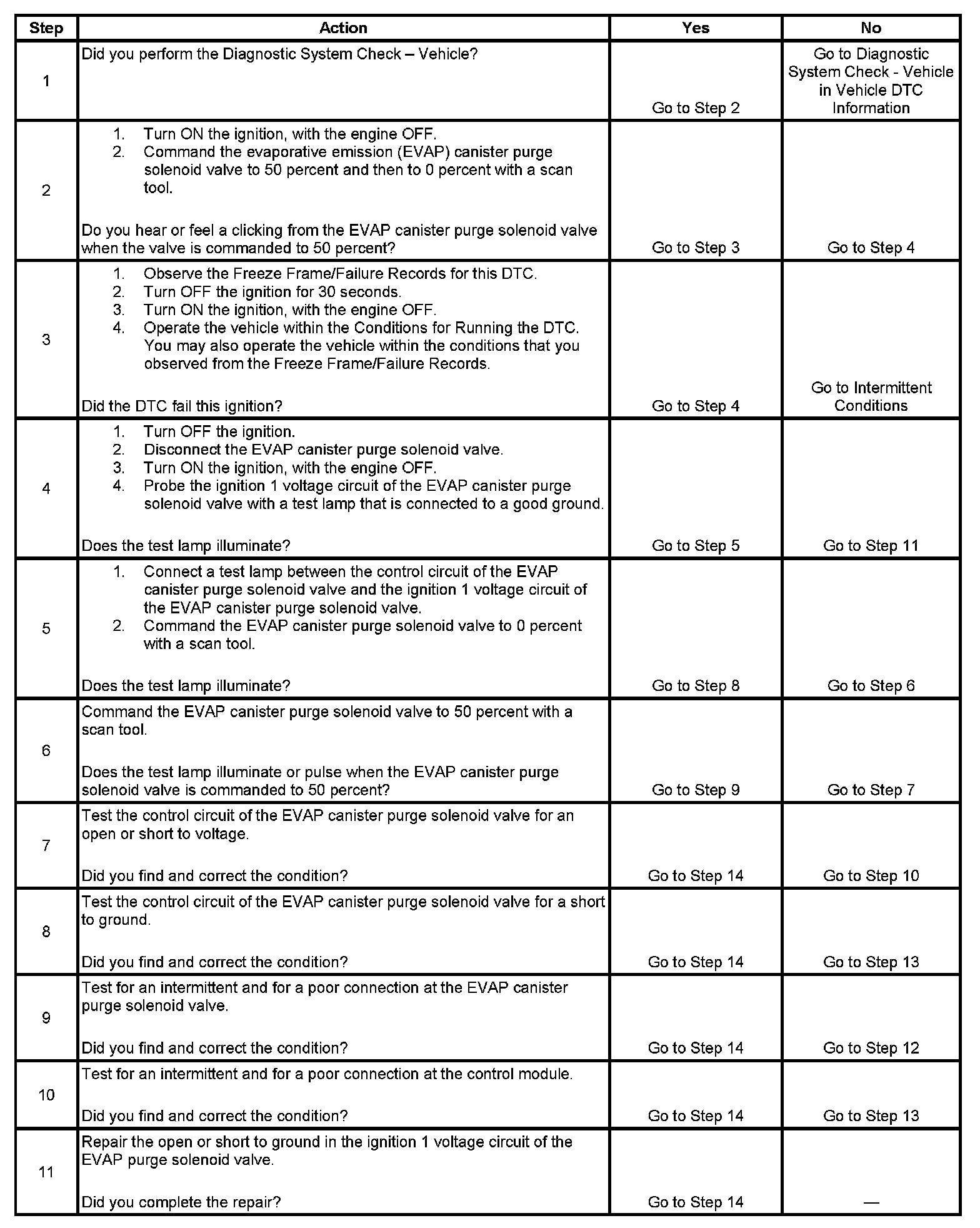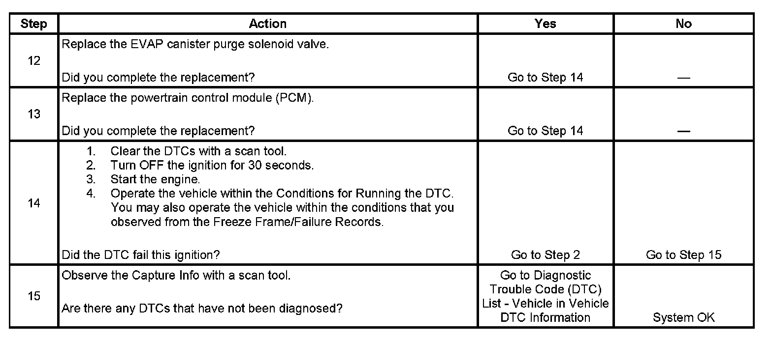 2. This step tests if the concern is active. The EVAP canister purge solenoid valve is PWM. Clicking should be heard or felt when the valve is commanded to 50 percent and should stop when the EVAP canister purge solenoid valve is commanded to 0 percent. The rate at which the valve cycles should increase as the commanded state is increased and decreased as the commanded state is decreased.
