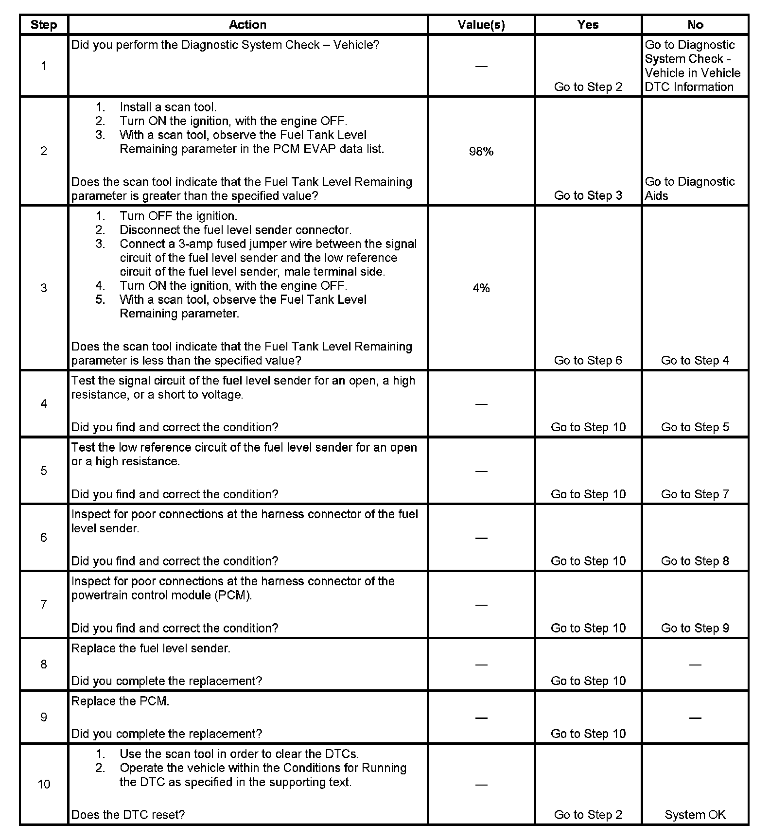 The fuel level sender changes resistance based on fuel level. The powertrain control module (PCM) monitors the signal circuit of the fuel level sender in order to determine fuel level. When the fuel tank is full, the sender resistance is high and the PCM senses a high signal voltage. When the fuel tank is empty, the sender resistance is low and the PCM senses a low signal voltage. The PCM uses the signal circuit of the fuel level sender in order to calculate the total remaining fuel (%) in the tank. The PCM sends the fuel level percent via the class 2 serial data circuit to the instrument cluster in order to control the fuel gage. The fuel level information is also used for misfire and evaporative emission (EVAP) diagnostics.