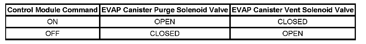 The table illustrates the relationship between the ON and OFF states, and the OPEN or CLOSED states of the EVAP canister purge solenoid and vent solenoid valves.