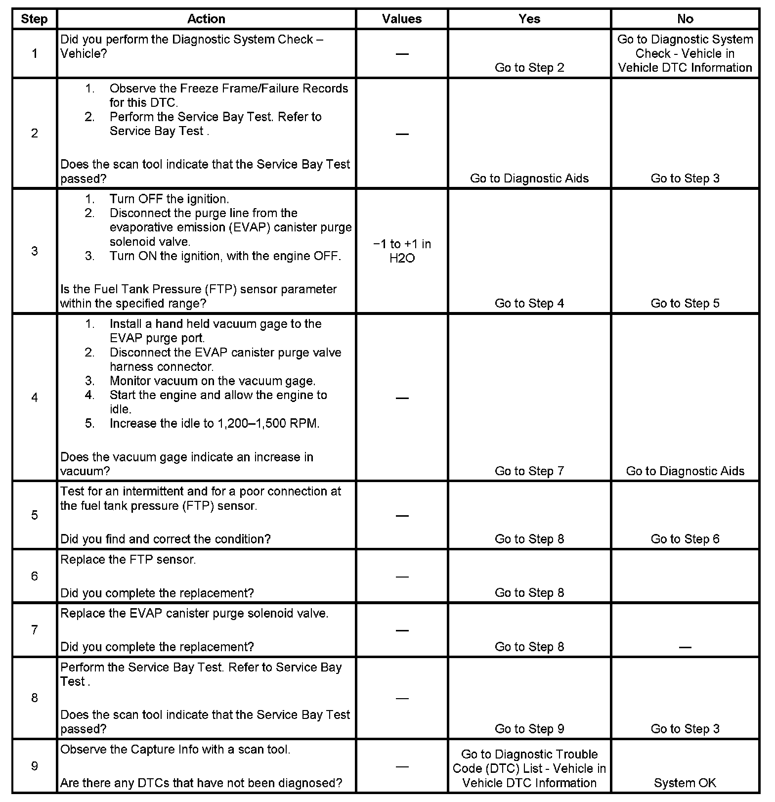 This DTC tests for undesired intake manifold vacuum flow to the evaporative emission (EVAP) system. The control module seals the EVAP system by commanding the EVAP canister purge solenoid valve CLOSED and the EVAP canister vent solenoid valve CLOSED. The control module monitors the fuel tank pressure (FTP) sensor to determine if a vacuum is being drawn on the EVAP system. If vacuum in the EVAP system is more than a predetermined value within a predetermined time, this DTC sets.
