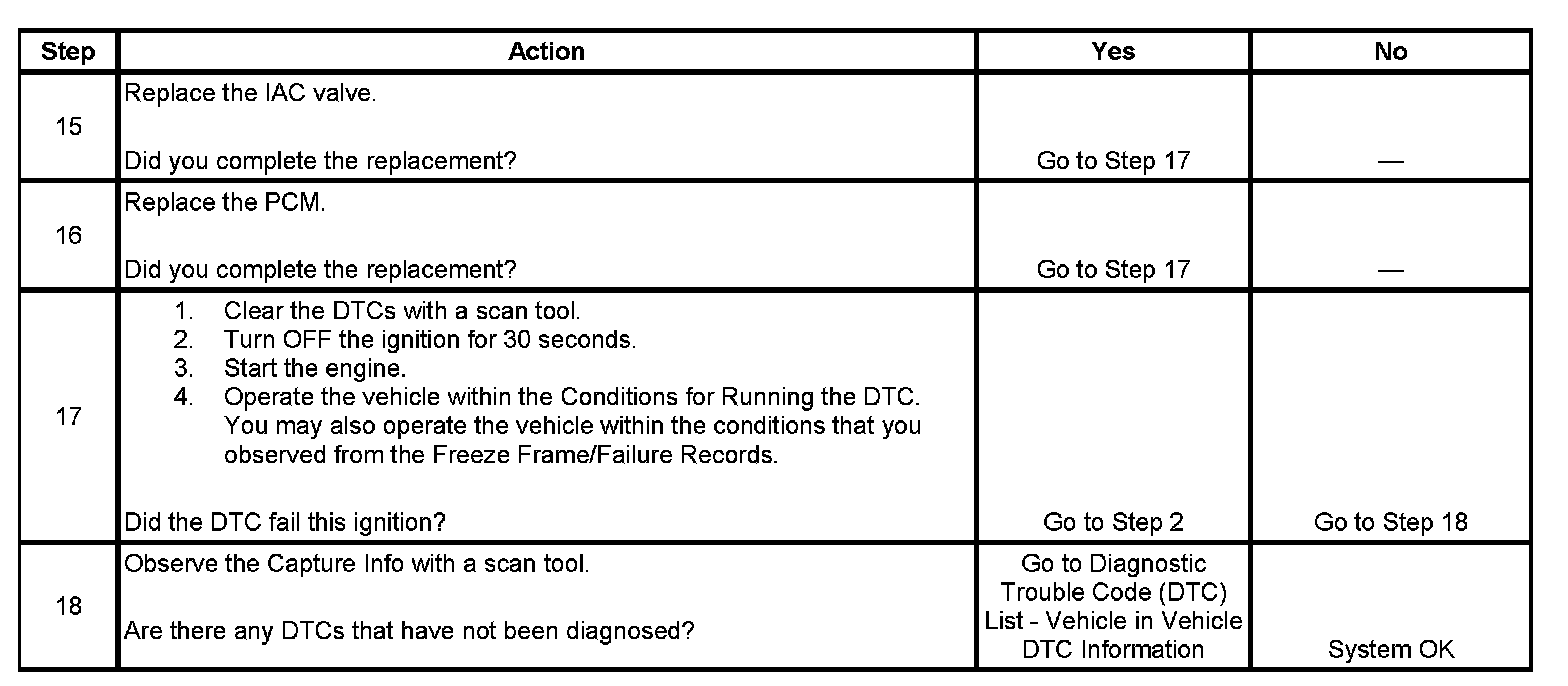 - The Engine Speed parameter is 100 RPM less than the Desired Idle Speed parameter for more than 8 seconds for each test.