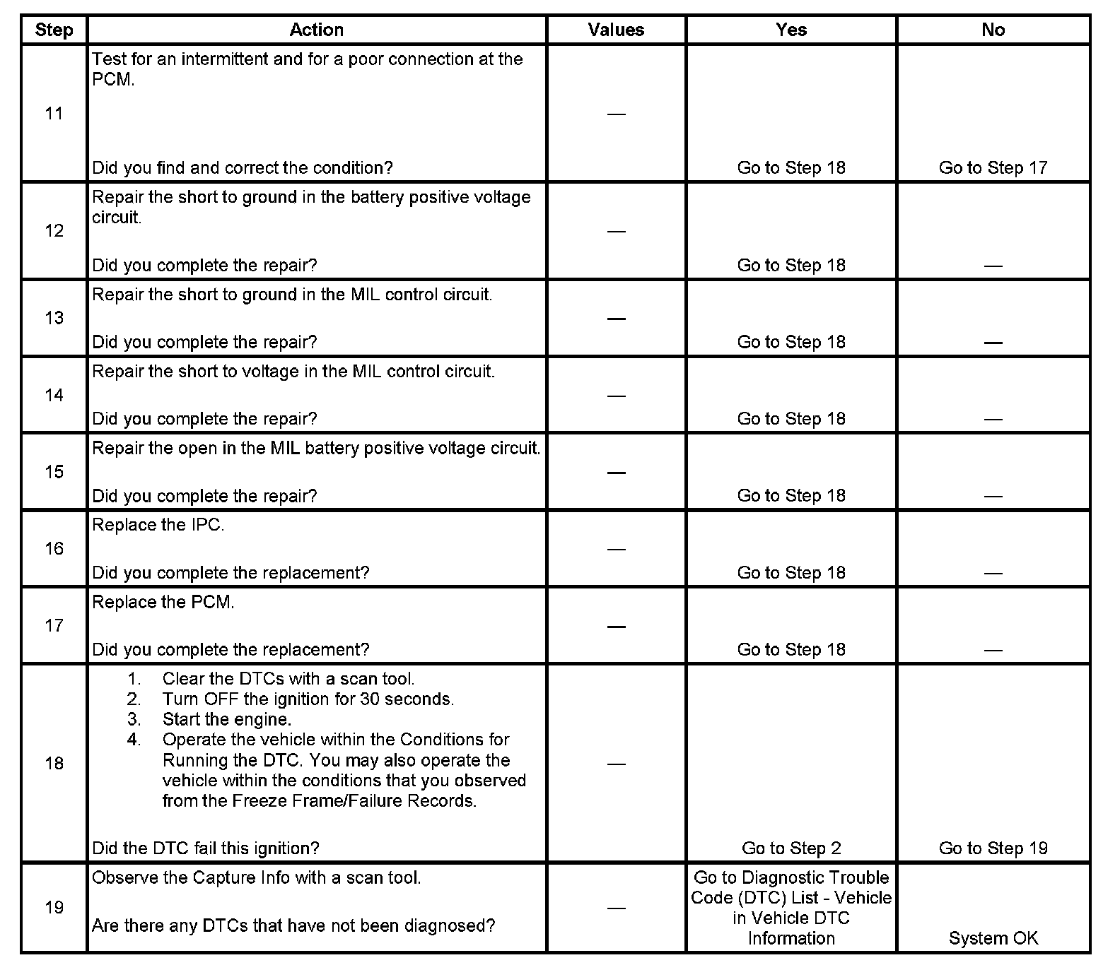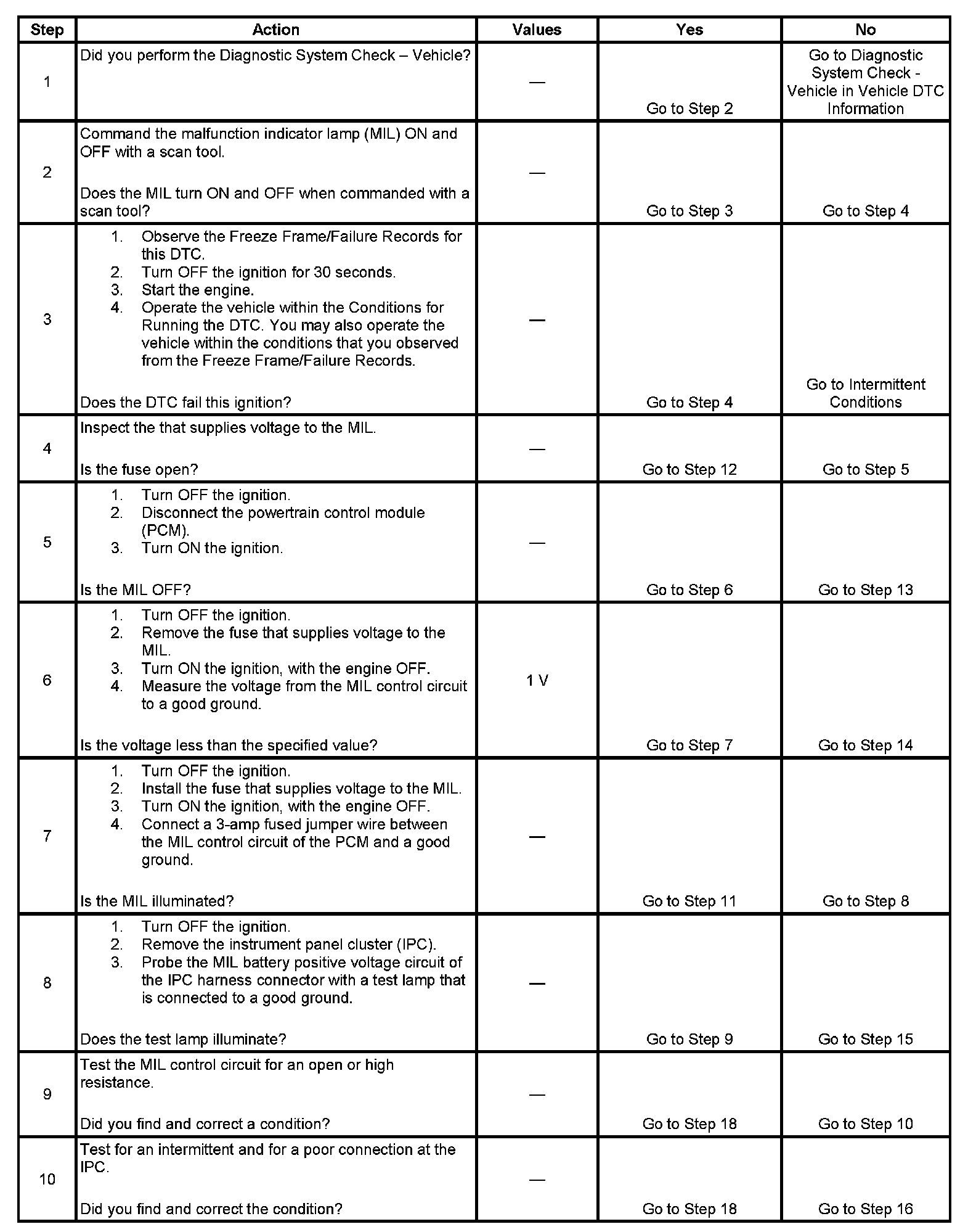 5. This step tests for a short to ground in the MIL control circuit. With the PCM disconnected and the ignition ON, the MIL should be OFF.