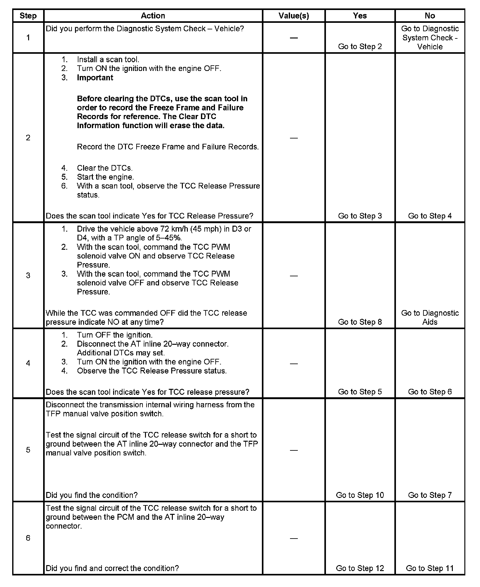 ^ If the scan tool indicated TCC release pressure was present in Step 2 and a mechanical or hydraulic condition was not found in Step 8, an intermittent short to ground condition may exist in the TCC release switch signal circuit.