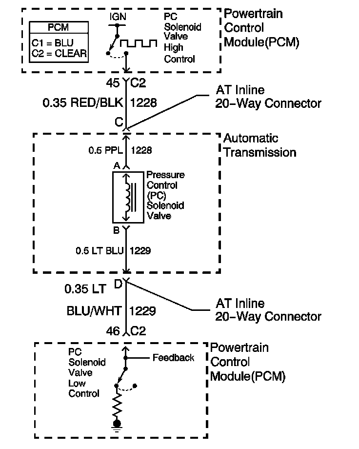 The pressure control (PC) solenoid valve is located in the valve body. The PC solenoid valve controls transmission line pressure based on current flow through its windings. The PCM determines desired line pressure based on throttle position and other inputs. The PCM then varies the duty cycle on the high side of the PC solenoid valve to control current flow to the solenoid. Current is controlled from about 0.02 amps for maximum line pressure to 1.1 amps for minimum line pressure. The PCM monitors the actual current to the solenoid.