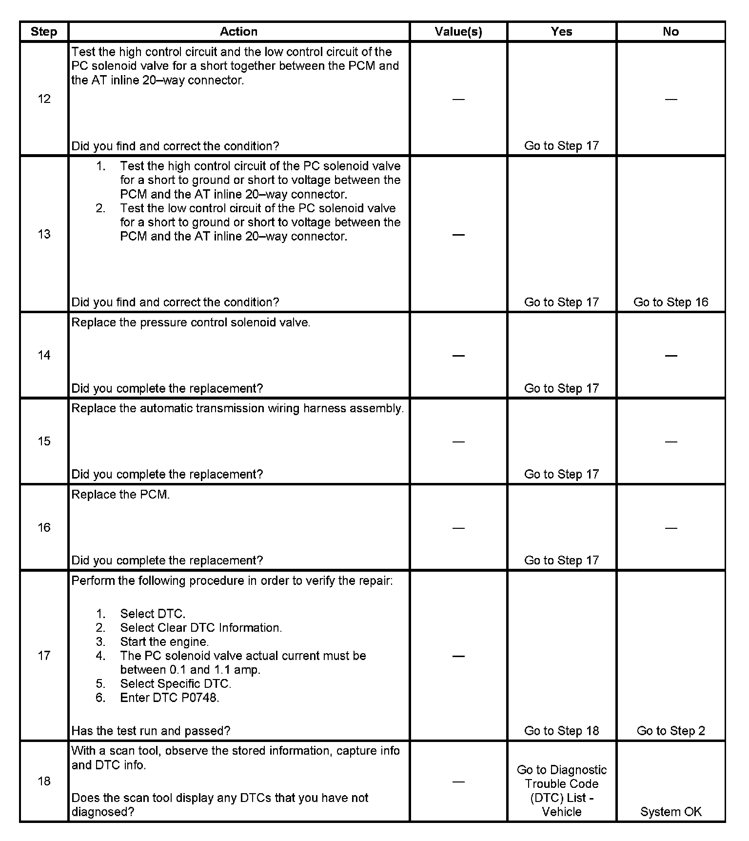 ^ If no circuit faults are detected during the 5 second retest period, then the PC solenoid valve is returned to normal operation and DTC P0748 diagnostic is passed.