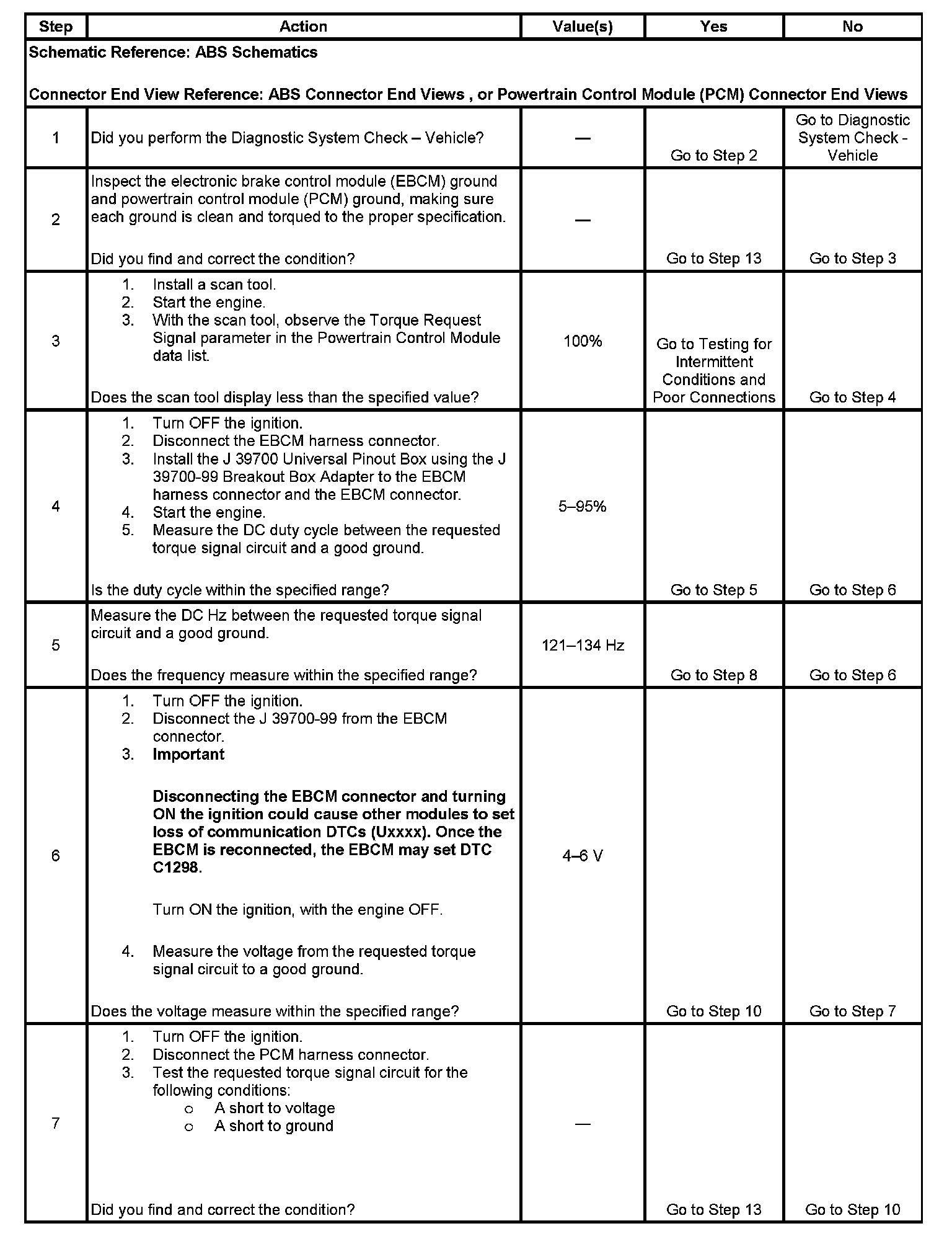 The PCM diagnoses the requested torque signal circuit and sends a serial data message to the EBCM indicating a fault is present.