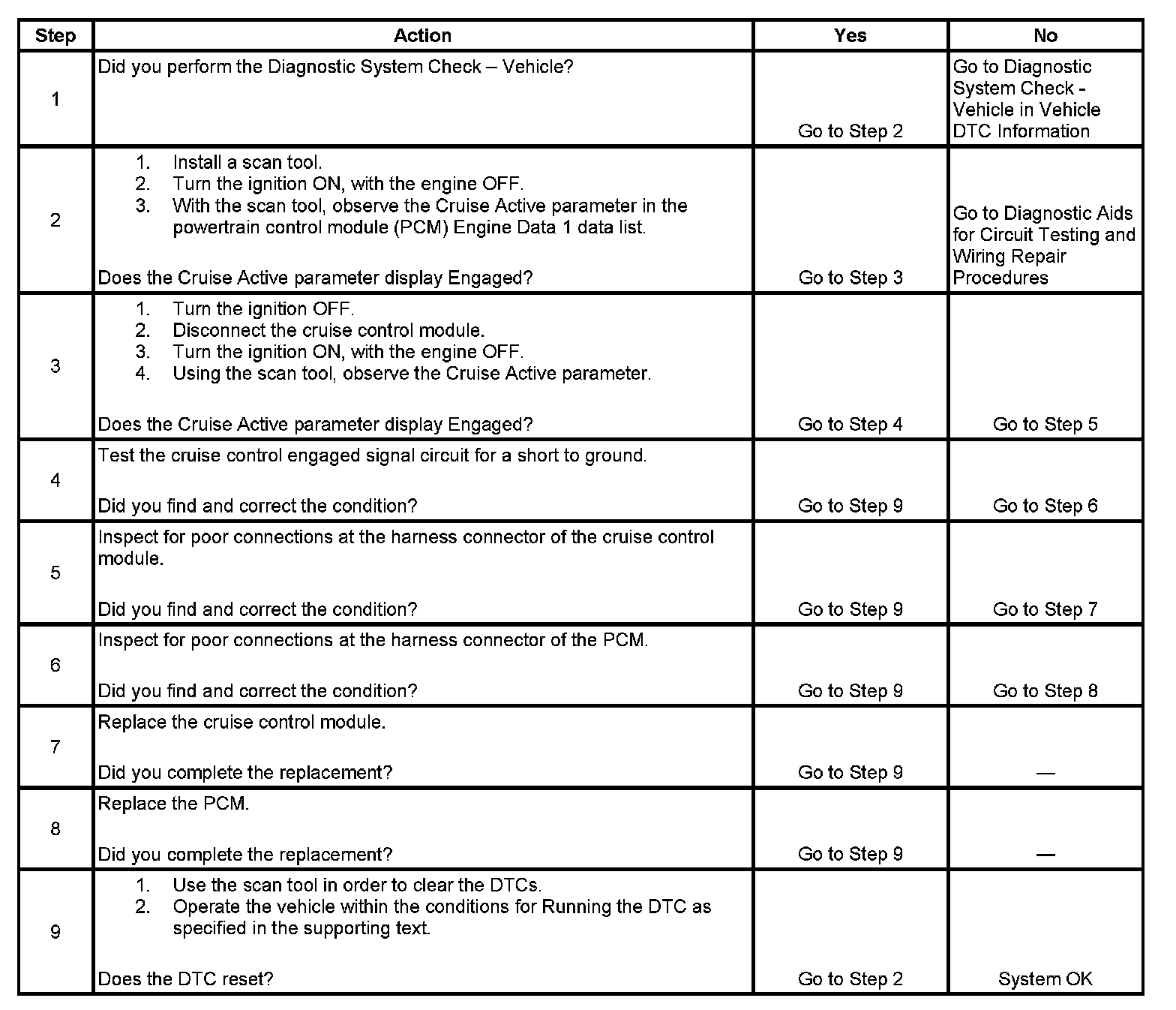 The PCM detects a cruise engaged signal from the cruise control module, while inhibiting cruise control operation.