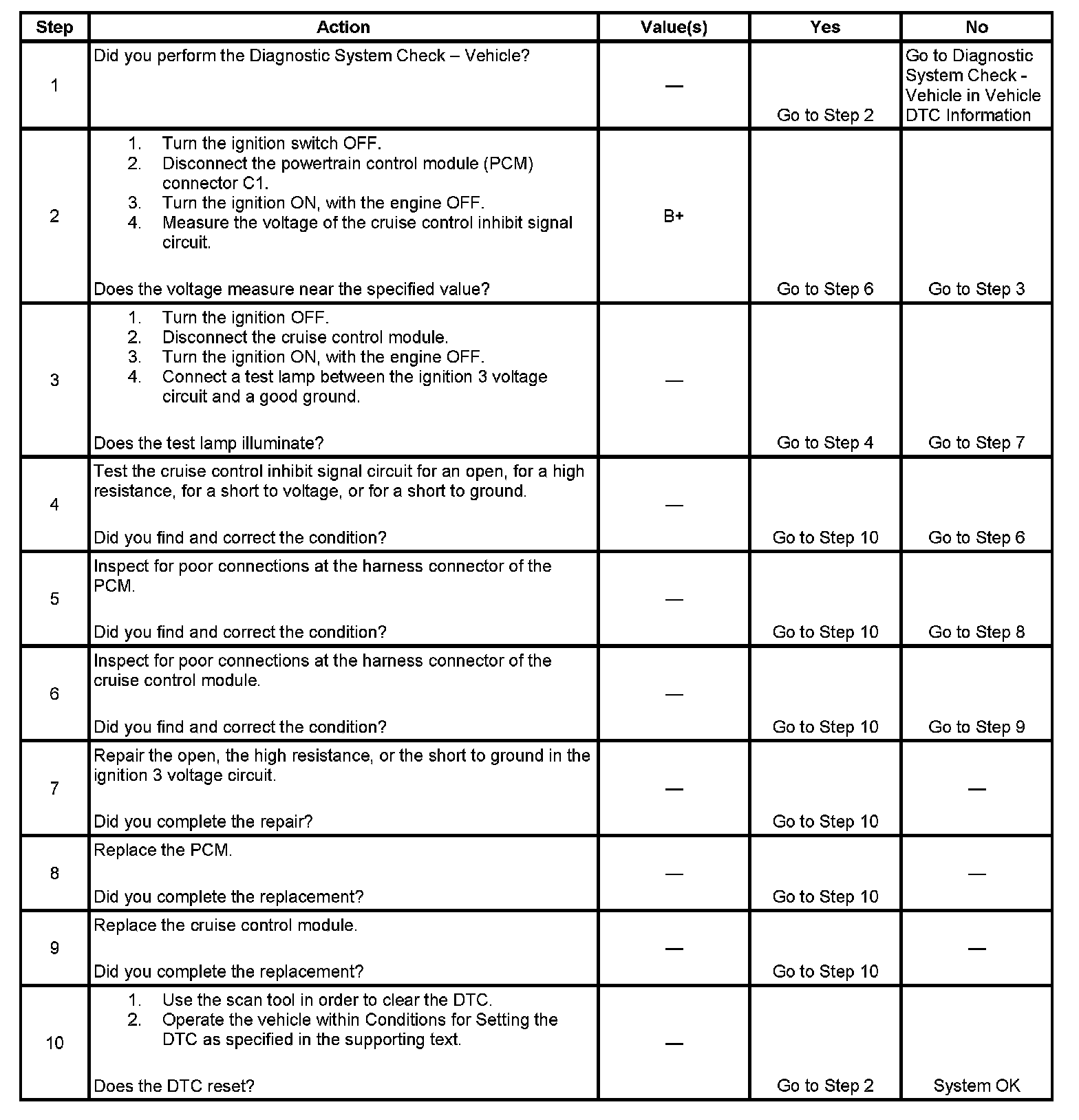 - The PCM detects that an improper voltage exists on the cruise control inhibit signal circuit.