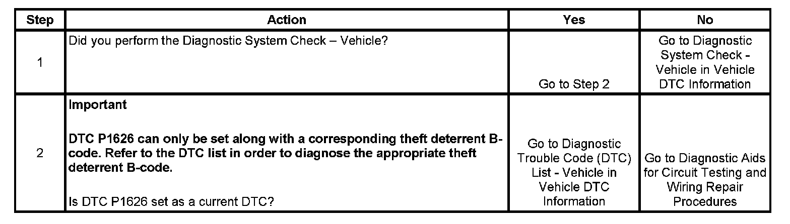 The body control module (BCM), produces the theft deterrent crank relay and fuel enable signal when ignition is ON and the proper ignition code voltage value is detected. The powertrain control module (PCM) monitors the fuel enable signal during crank. If the proper signal is present on the class 2 serial data circuit, the PCM enables the fuel delivery in order to allow the engine to start. If the PCM determines that the fuel enable signal is not present, or incorrect while the engine is running, DTC P1626 is set. The engine continues to start and run as long as DTC P1626 is stored. If the problem affects inputs to the vehicle theft deterrent (VTD) signal, the starter motor may be disabled.