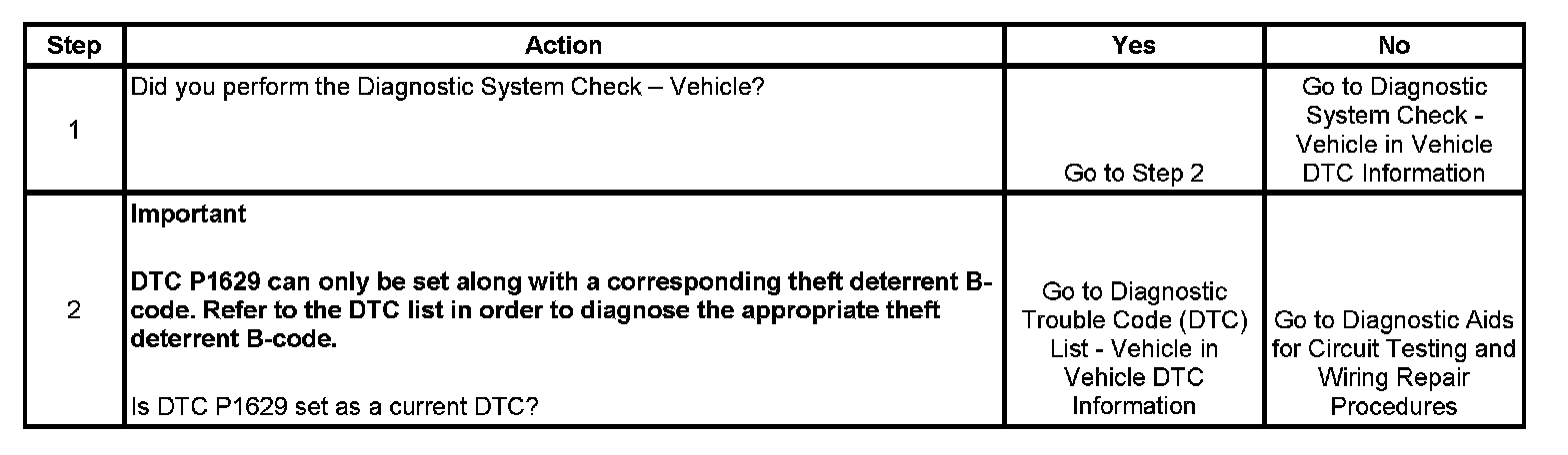 The body control module (BCM) produces the theft deterrent crank relay and fuel enable signal when ignition is ON and the proper ignition code voltage value is detected. The powertrain control module (PCM) monitors the fuel enable signal during crank. If the proper signal is present on the class 2 serial data circuit, the PCM enables the fuel delivery in order to allow the engine to start. If the PCM determines that the fuel enable signal is not present, or incorrect during engine crank, DTC P1629 is set. The engine will not start as long as DTC P1629 is stored.