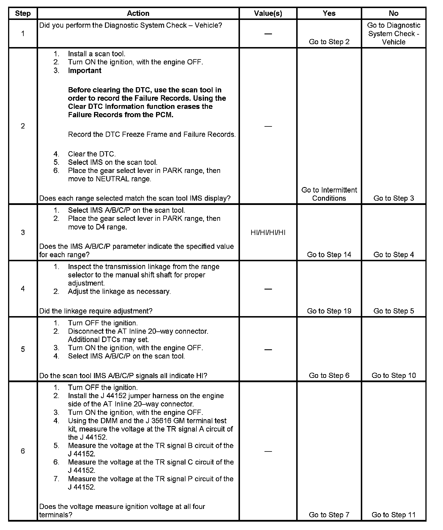 The transmission internal mode switch (IS) is a sliding contact switch attached to the selector detent inside the transmission side cover. The four inputs to the PCM indicate the position of the transmission range selector. The input voltage level at the PCM is high, B+, when the IMS is open and low when the switch is closed to ground. The four input parameters represented are Signals A, B, C and P - Parity. Refer to Transmission Internal Mode Switch Logic.