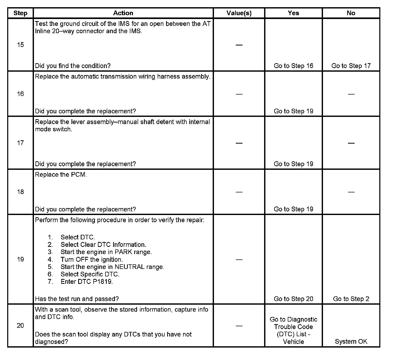 If the PCM detects a combination of IMS signals that are not PARK or NEUTRAL while attempting to start the vehicle, then DTC P1819 sets. DTC P1819 is a type C DTC.