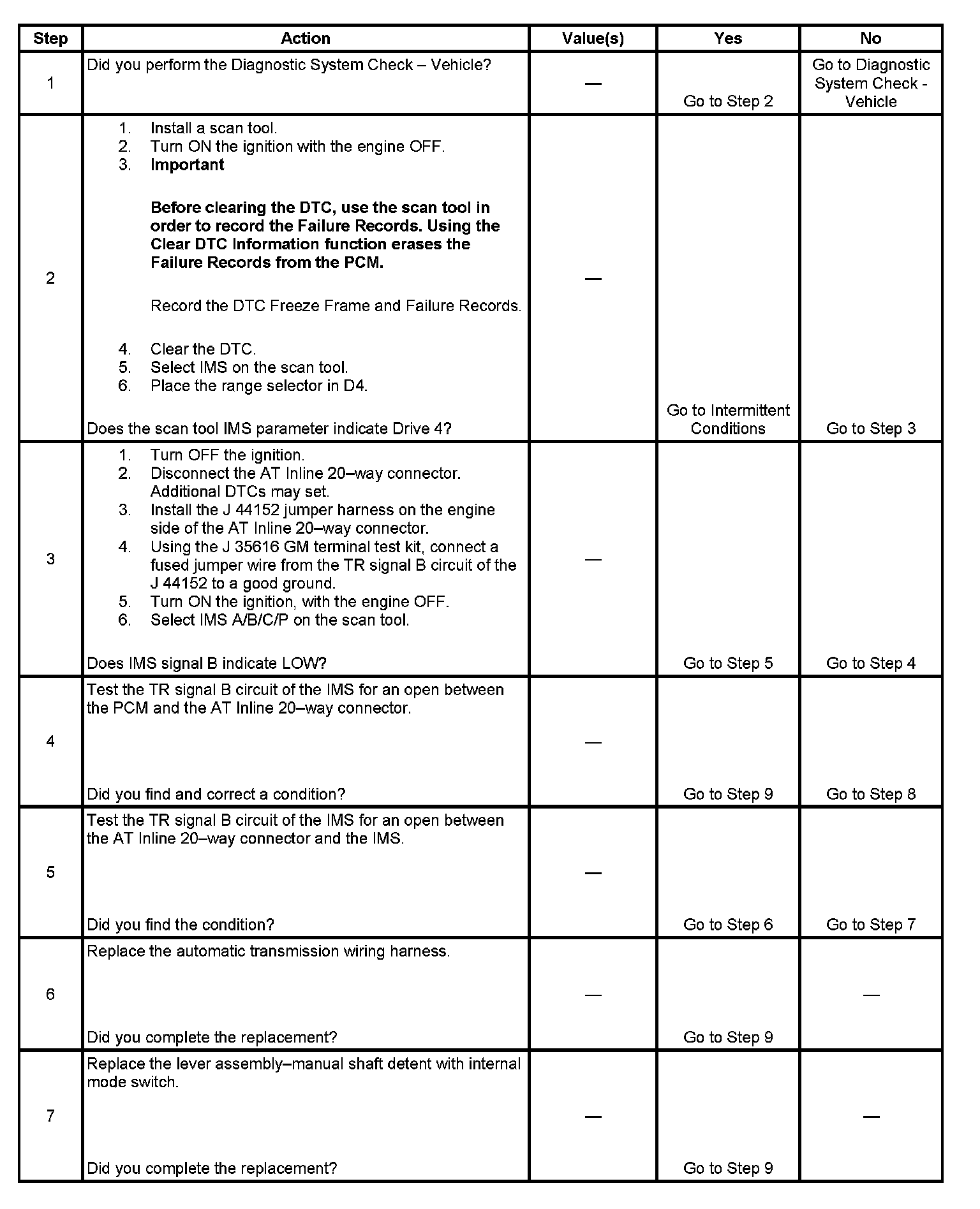 3. This step tests the integrity of the engine harness and PCM by checking for the Signal B state change from HI to LOW. A LOW signal indicates the fault is either in the internal transmission harness or the switch. A HI signal indicates the fault is either in the engine harness or the PCM.