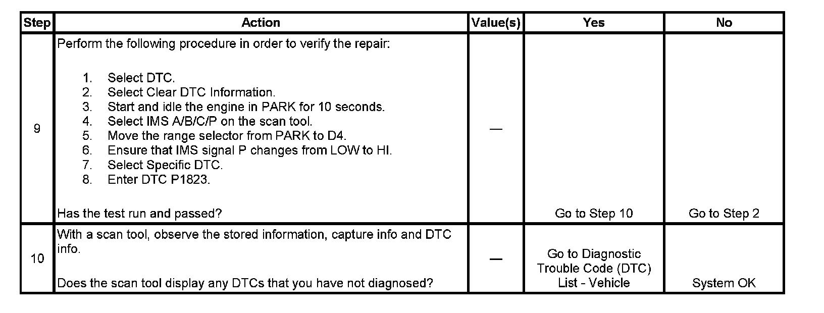 If the PCM detects that IMS Signal P is always low, then DTC P1823 sets. DTC P1823 is a type C DTC.
