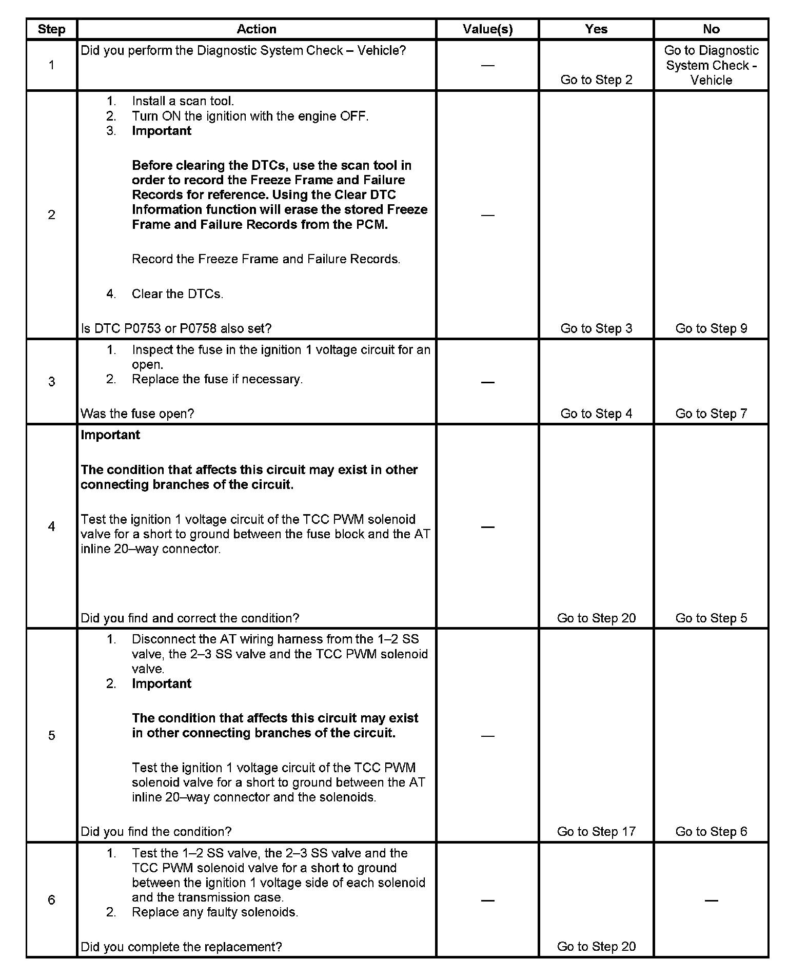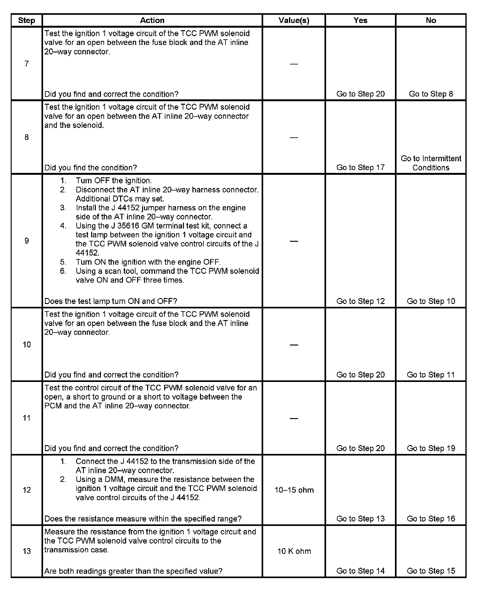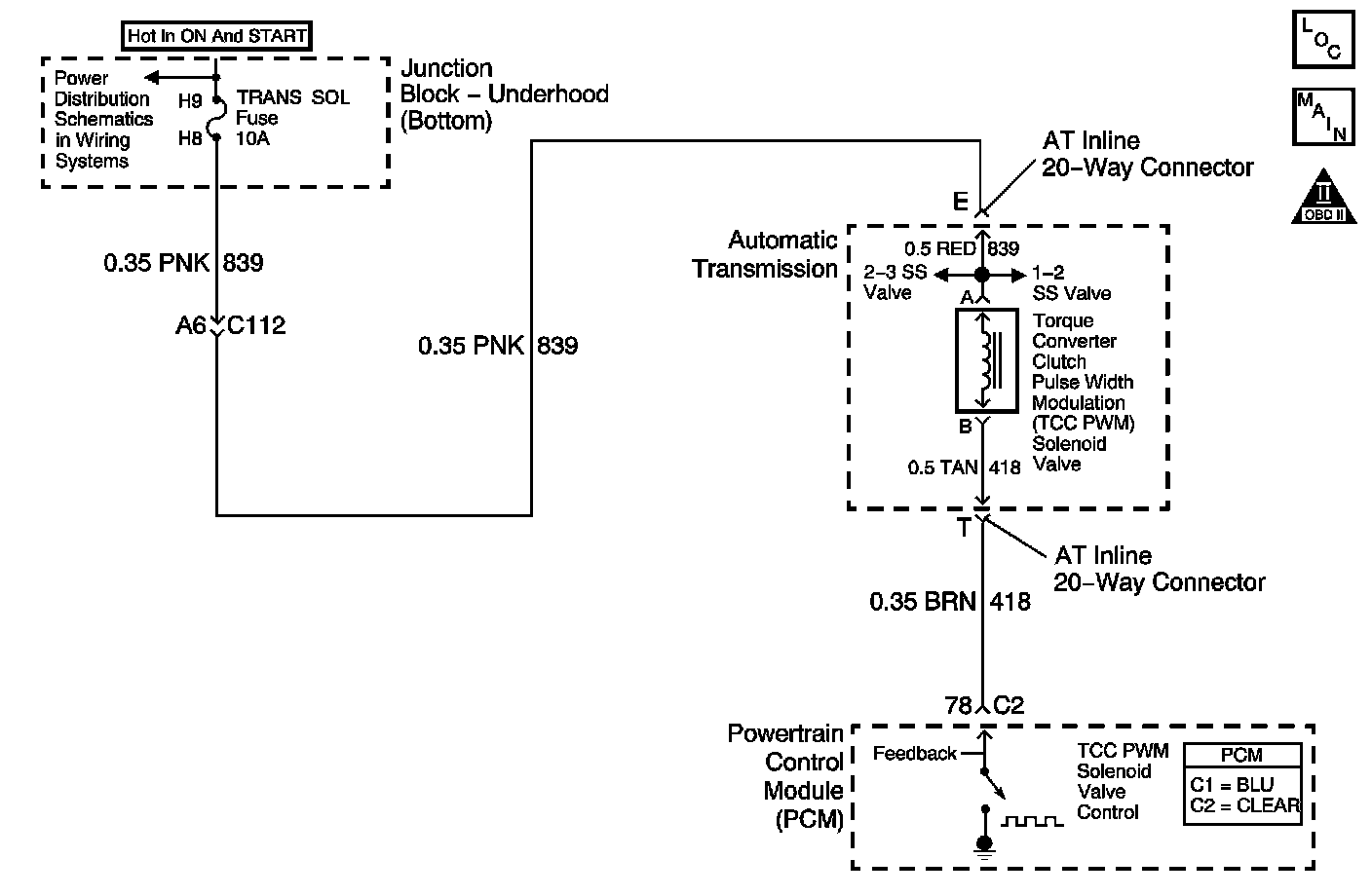 Ignition voltage is provided to the torque converter clutch pulse width modulation (TCC PWM) solenoid valve. The PCM controls the solenoid with a negative duty cycle in order to control application and release of the TCC. When the solenoid is commanded OFF, the PCM senses high voltage. When the solenoid is commanded ON, the PCM senses low voltage.