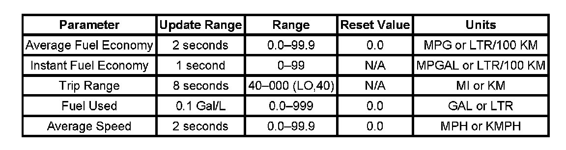 You can reset the Fuel Used mode by pressing the RESET button for more than 3 seconds while in this mode. The value of this mode is retained during ignition OFF.