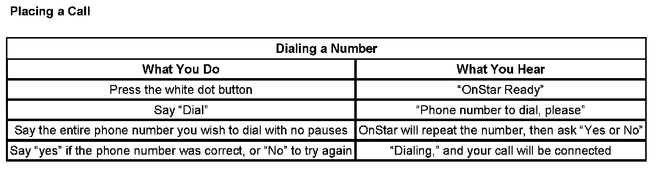 The hand free, OnStar(R) personal calling (OPC) cellular phone feature is an additional option to the OnStar(R) system. This feature is already embedded within the vehicle communication interface module (VCIM), however, it must be activated by an OnStar(R) advisor. This is done most often during the initial OnStar(R) configuration, if the home location of the vehicle is in a geographic area where OnStar(R) personal calling is available. In the event this feature is not enabled, customers may connect to the OnStar(R) Call Center by pressing the blue OnStar(R) button, and asking an advisor if OPC is available in their area. Users of the Generation 6 OnStar(R) system can verify the system has been configured for OnStar(R) Personal Calling by pressing the answer/end call button, waiting for the system to respond "OnStar Ready" then speaking the word "dial." If the system responds with a failure message, the system has not been configured for OPC. All other responses confirm that OPC has been enabled.