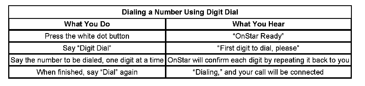 After 3 unsuccessful tries, or if you simply like it better, you can use the "Digit Dial" command to input digits one at a time, with OnStar(R) repeating each digit for verification.