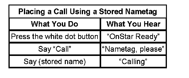 Customers have the ability to store telephone numbers within the module, referenced by a nametag for the convenience of frequently dialed numbers. This process is initiated by pressing the answer/end call button, waiting for the system response, then speaking the response "store". The system will respond with "number please" at which time the user should enter the number desired to be stored. Once complete, saying the word "store" again lets the system know you are finished entering the number. At this time, the system will elicit the user to assign a nametag to that number. From this point forward, the user can dial this number by initiating the OnStar(R) personal calling (OPC) feature, speaking the word "call," and repeating the nametag assigned. To delete a nametag, the user should initiate OPC, say "delete" then speak the nametag to be removed. In the event a nametag cannot be deleted in spite of repeated attempts from several speakers, the OnStar(R) module will require replacement.