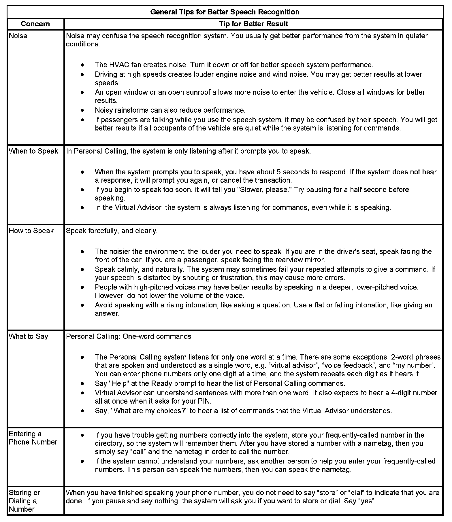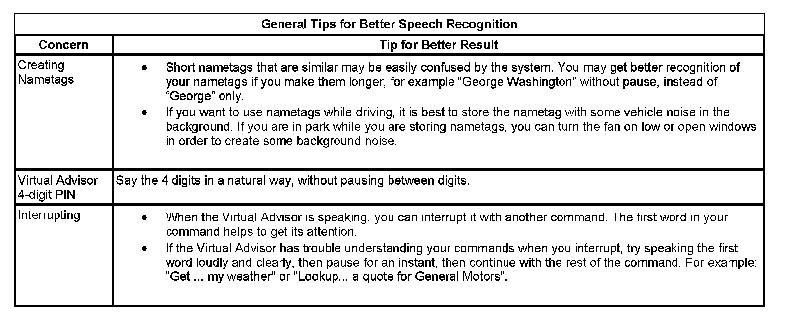 The OnStar(R) speech recognition systems use speech technology that is designed to understand a wide range of American English speakers. Although there is no one right way to speak English, the system will work best when users try to modify their pronunciation should they encounter difficulty. Users who do not obtain good results are advised to try the tips and workarounds.