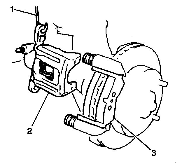 1. Remove the brake caliper from the mounting bracket and support the brake caliper (2) with heavy mechanic's wire (1), or equivalent. Discard the old caliper pin bolts, new bolts are supplied in the hardware kit. It is not necessary to disconnect the hydraulic brake flexible hose from the caliper.