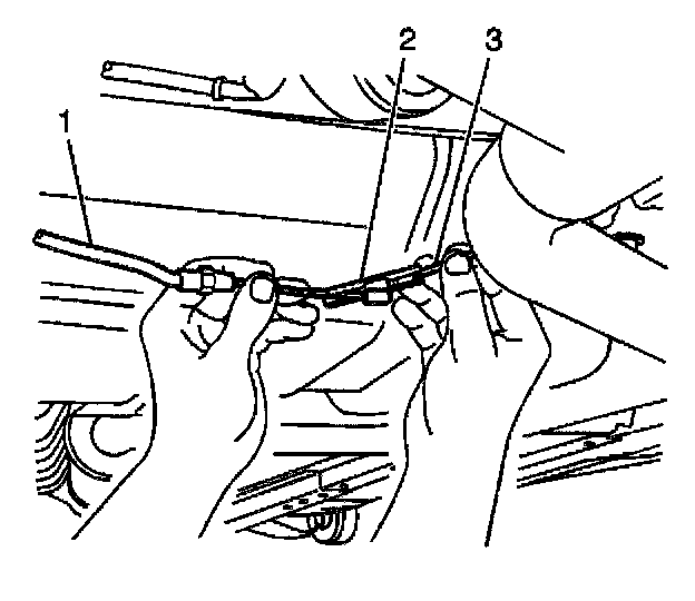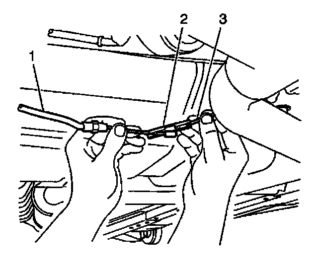 3. Disconnect the front park brake cable (1) from the right rear cable (3) at the connector clip (2).