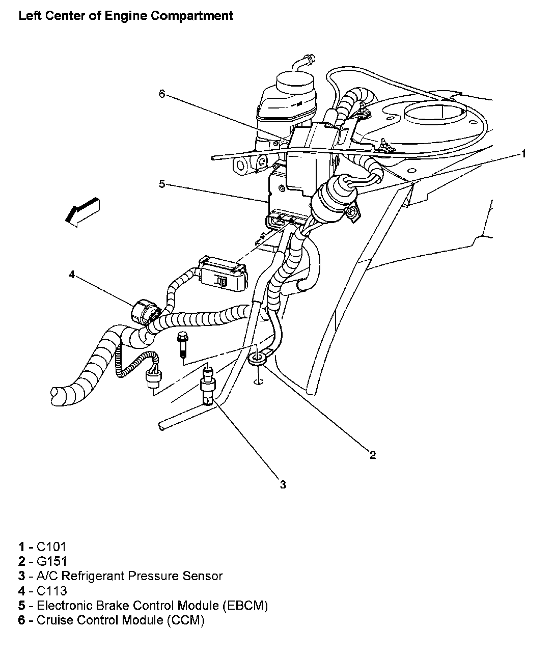 Left Center Of Engine Compartment: