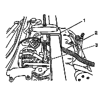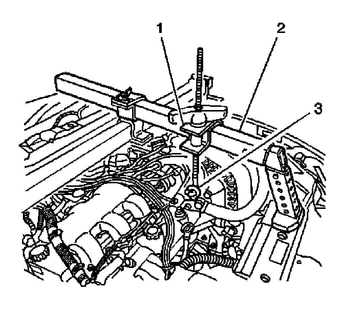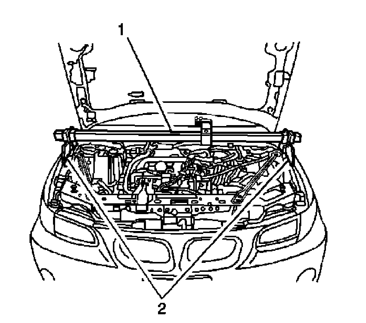 4. Install the J 28467-B (1) and the J-28467-501 (2) to the fender rails.